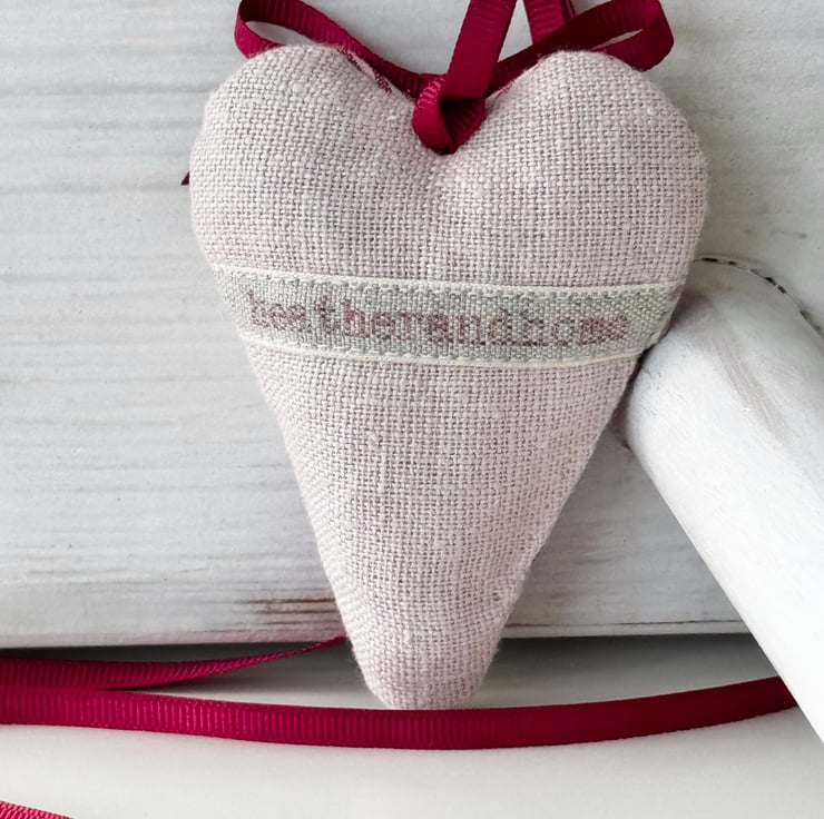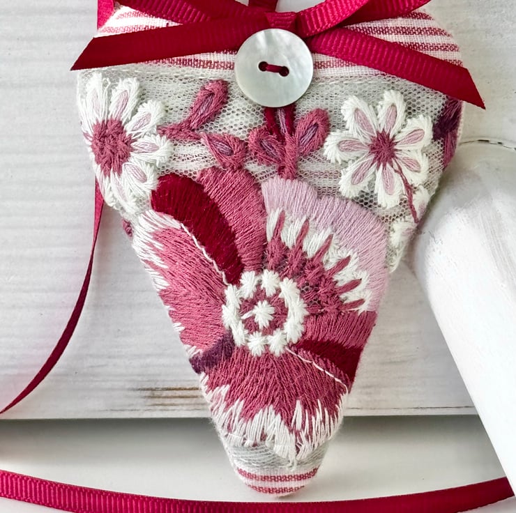 The Pink Blossoms Heart features a beautiful array of flowers in every shade of pink - from oyster through blush, clover and cardinal - embroidered onto a gauzy palest-aqua ribbon, set against soft pink stripes and with a reverse side in blush pink linen. Filled with relaxing and fragrant Hampshire lavender, and finished with a round mother-of-pearl button, and a rich pinky-red grosgrain ribbon bow and hanging ties.