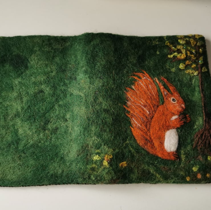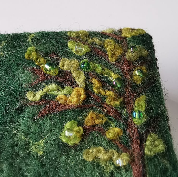 Hand felted journal cover, decorated with glass beads and embroidery, lined with cotton fabric.