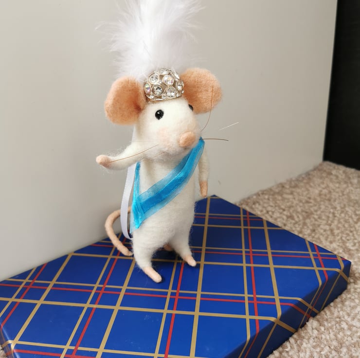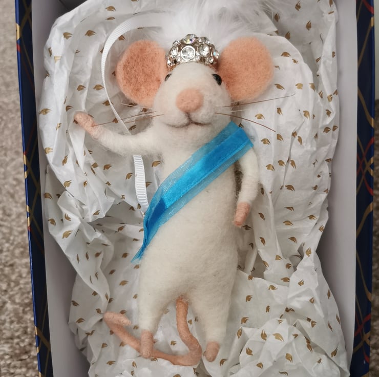Hand felted queen mouse with ribbon attached for hanging, decorated with blue ribbon and tiara