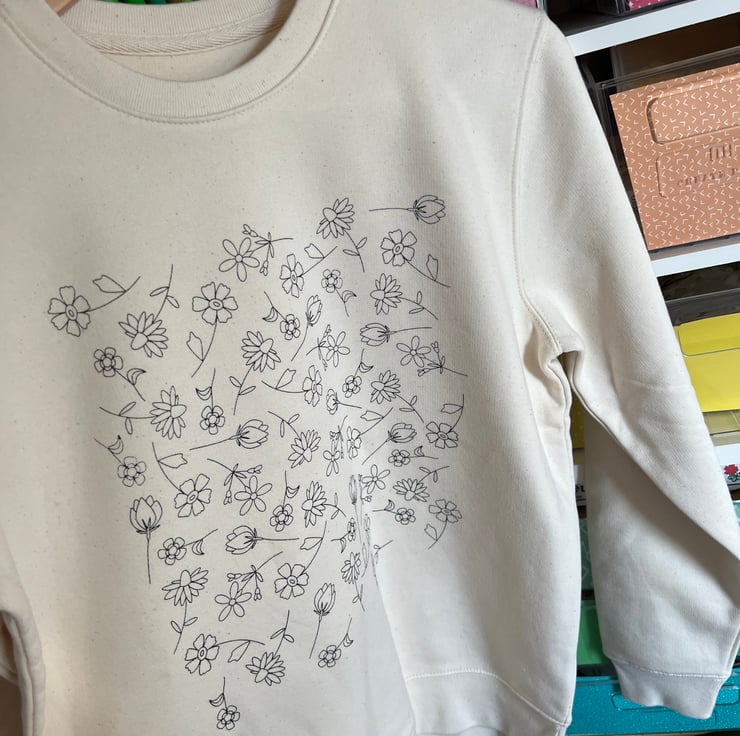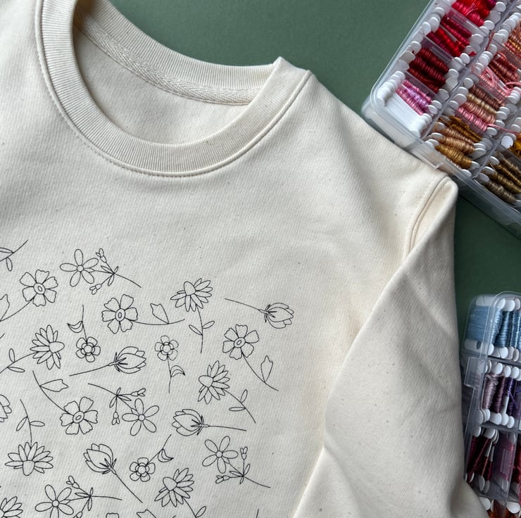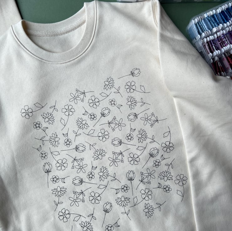 A beautiful organic sweatshirt with black print ready for you to stitch in your own chosen colours. These lovely 350gsm weight sweatshirts are stunning to stitch. Each sweatshirt comes with a simple suggested stitch guide. Stitch all at once, or over a matter of months, these sweatshirts can be worn at all stages of stitching!