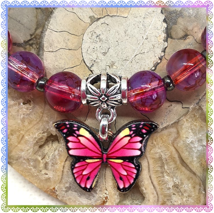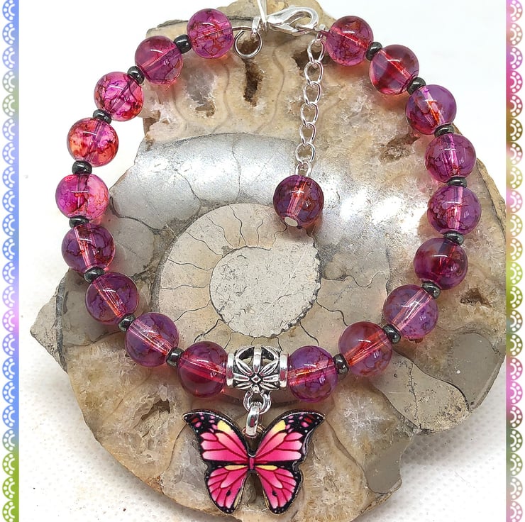 OOAK enamelled red butterfly charm with 8 mm dragon vein beads, spacer beads & Tibetan silver connector threaded onto stainless steel memory wire with trigger clasp & extension chain. Nickel free