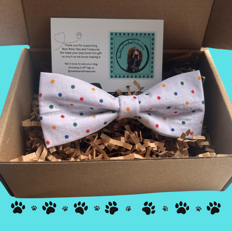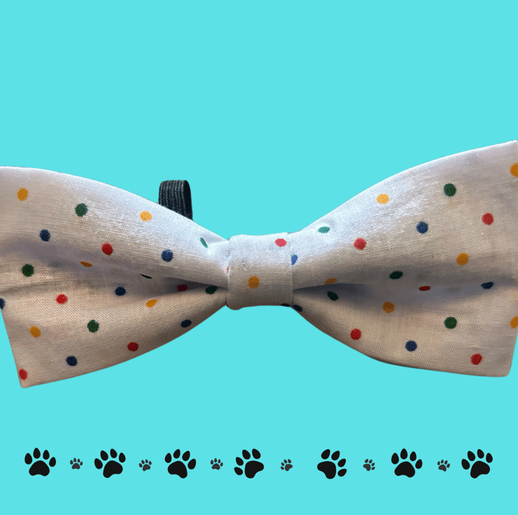 Dog bow tie. White with colourful dots. Very cute and smart!
