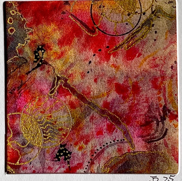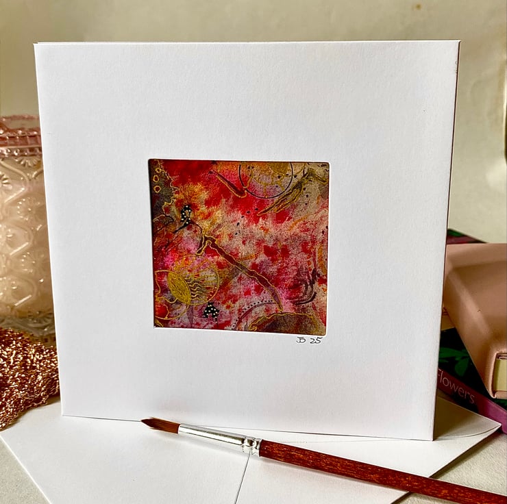 Hand painted abstract design on watercolour paper, cold press, acid free, 300 gsm. Mounted in square tri-fold aperture card 300gsm (13.5 x 13.5 cm). Blank inside for your own personal message. Comes with white envelope.