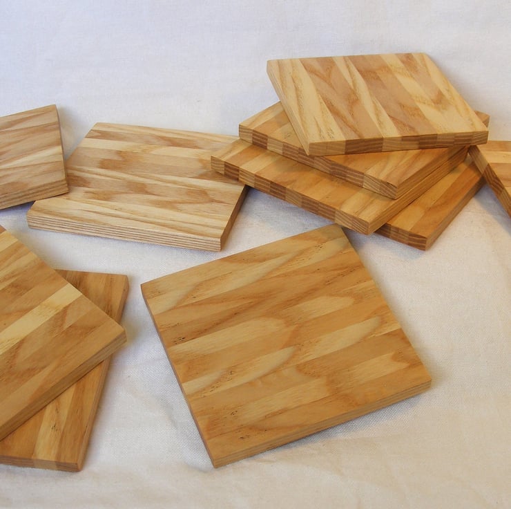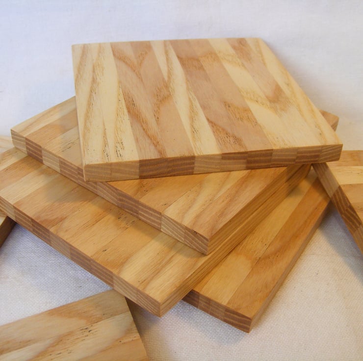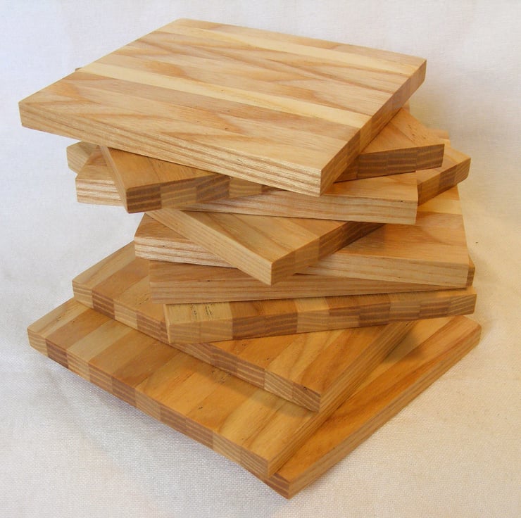 Laminated Ash coasters 104 x 104 mm x 9mm approx. Laminated Ash coasters made from reclaimed Ash, the Ash has a very striking grain pattern, which combine with the lamination to create a give a swirling stripe pattern.
