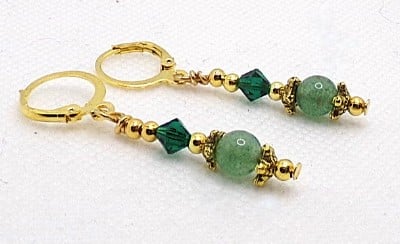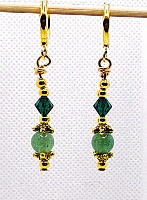 Dainty earrings that I have made using 6mm gemstone milky green aventurine and 6mm Precoisa crystals in a deep emerald green. These are accentuated with gold plated bead caps and spacer bead. These earrings have gold plated French lever backs.