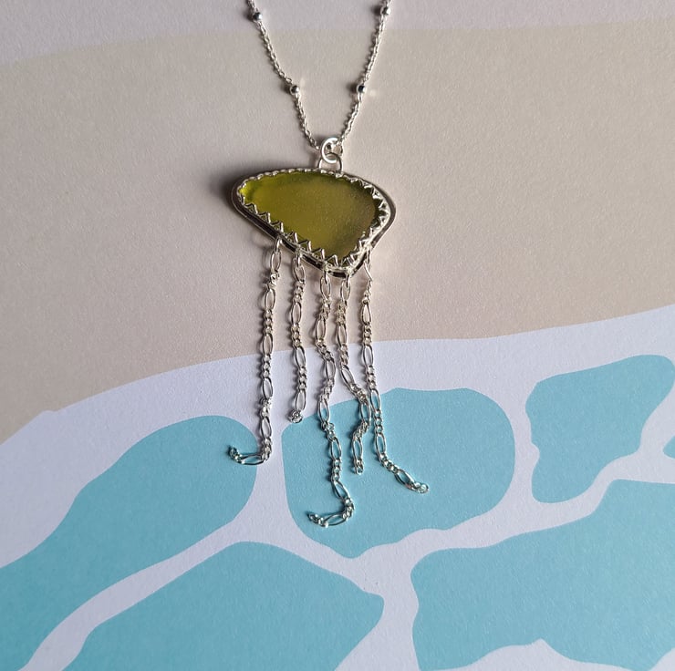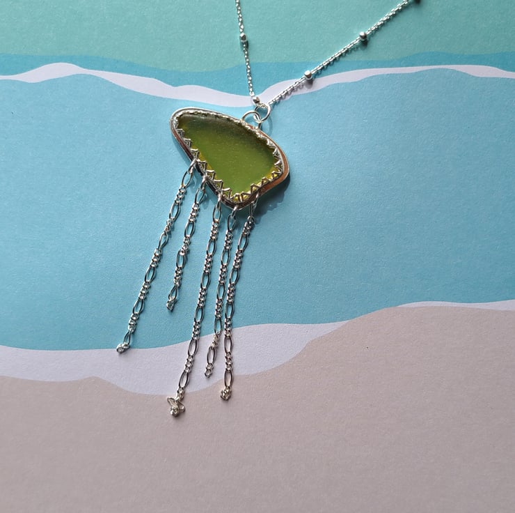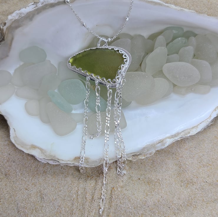 This stunning piece of olive yellow sea glass is set in sterling silver, with 5 silver chain tentacles, to create a one of a kind pendant.