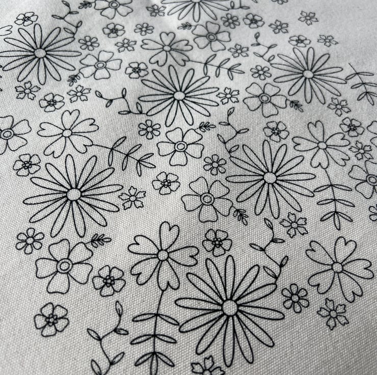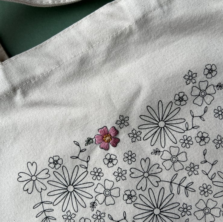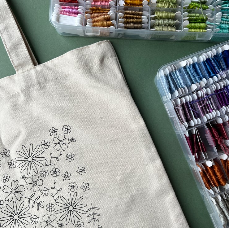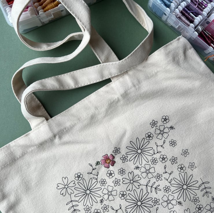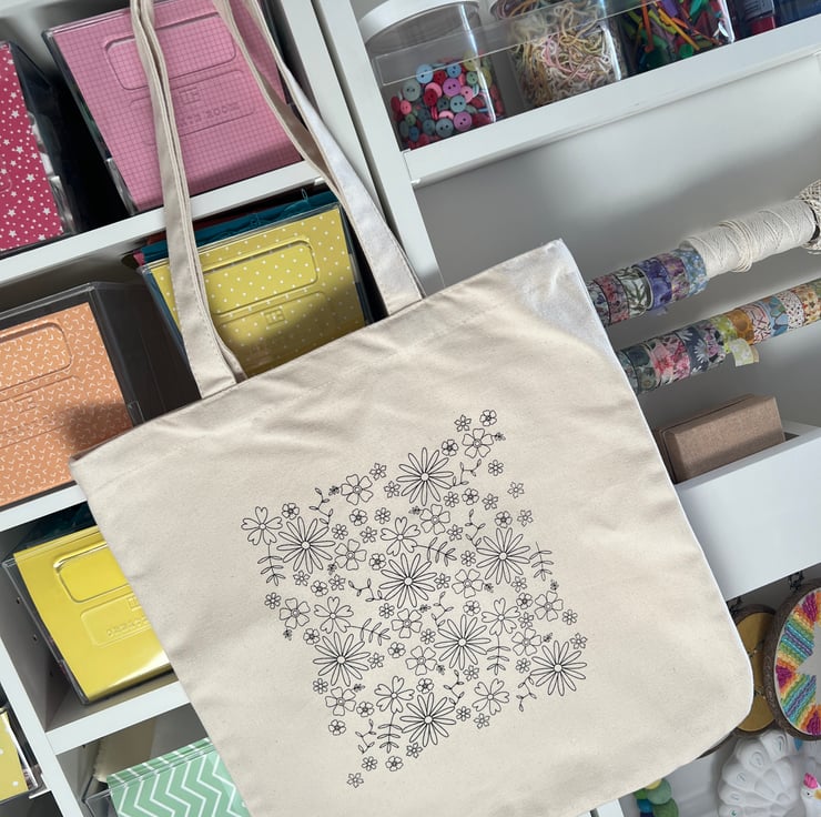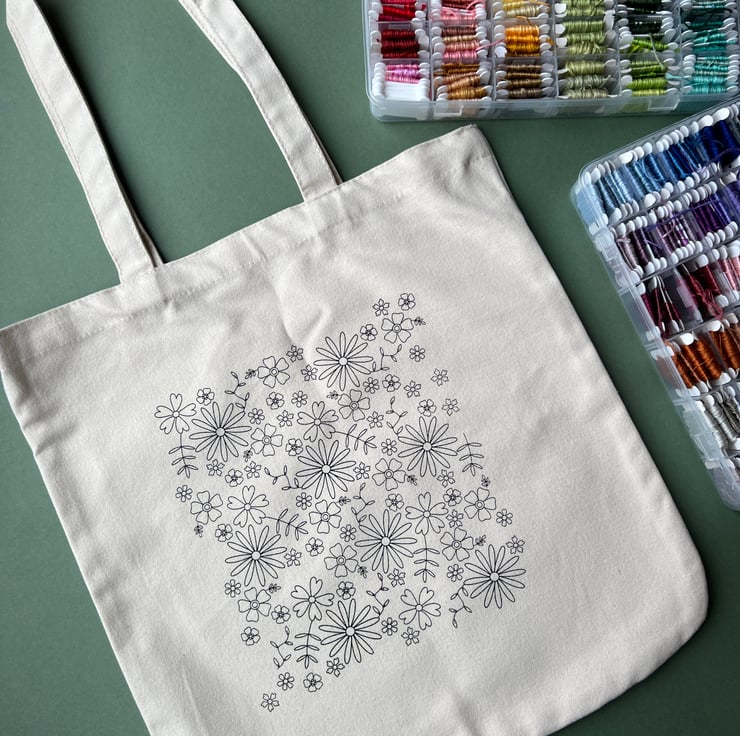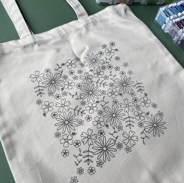 A gorgeous tote bag to embroider in your own choice of colours. Each one printed in a black floral design. The bag can be used over the shoulder or in hand. Strap length 63cm. Simple stitch guide included.