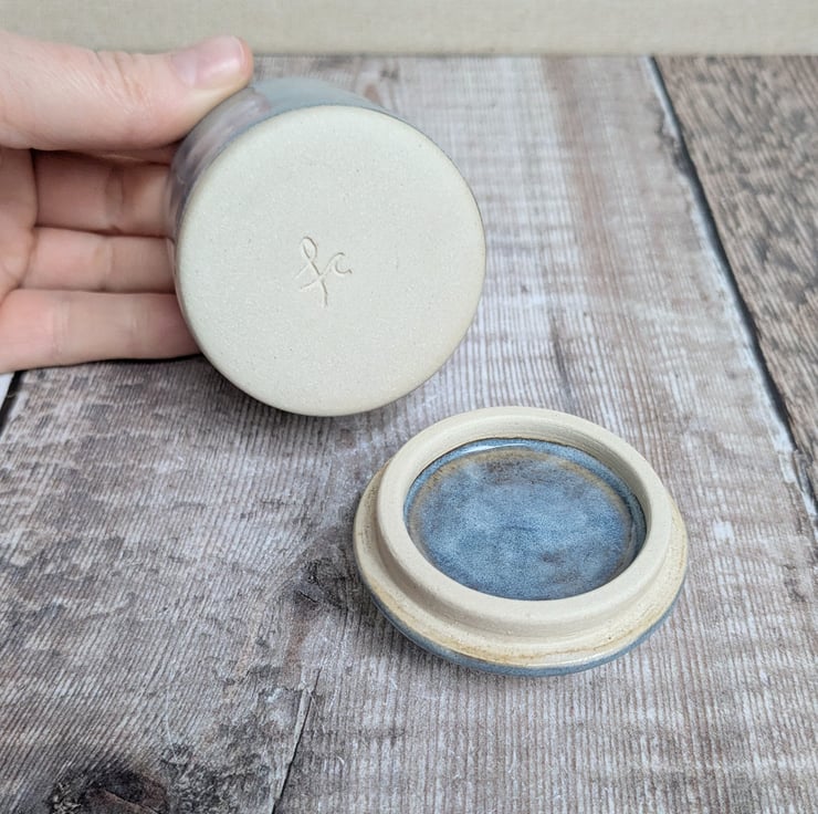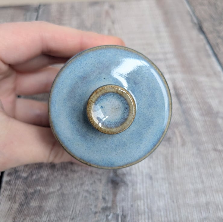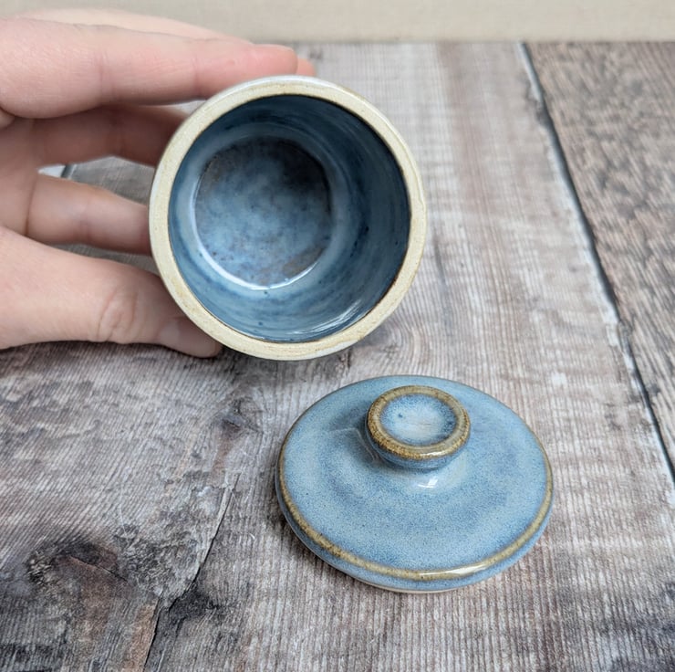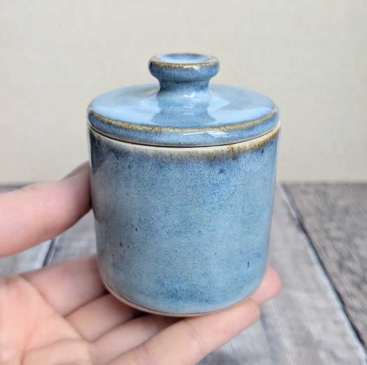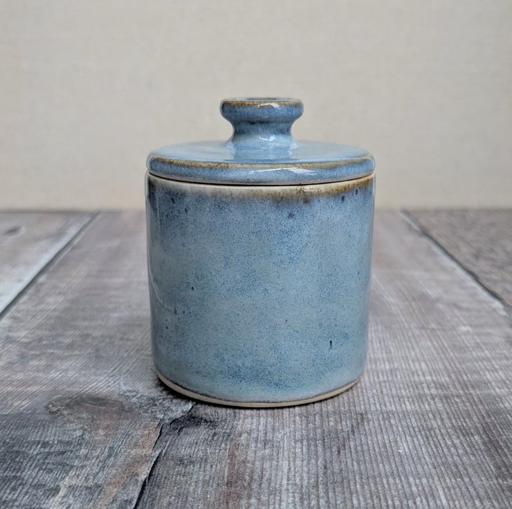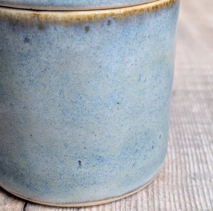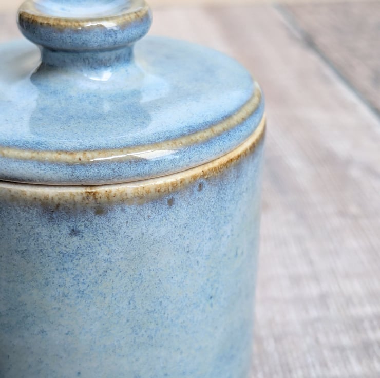 A small lidded pot thrown on the pottery wheel from a white stoneware clay. A small circular knob is central on the lid. The pot is glazed a light blue colour, breaking brown over the edges and variation across the surface.