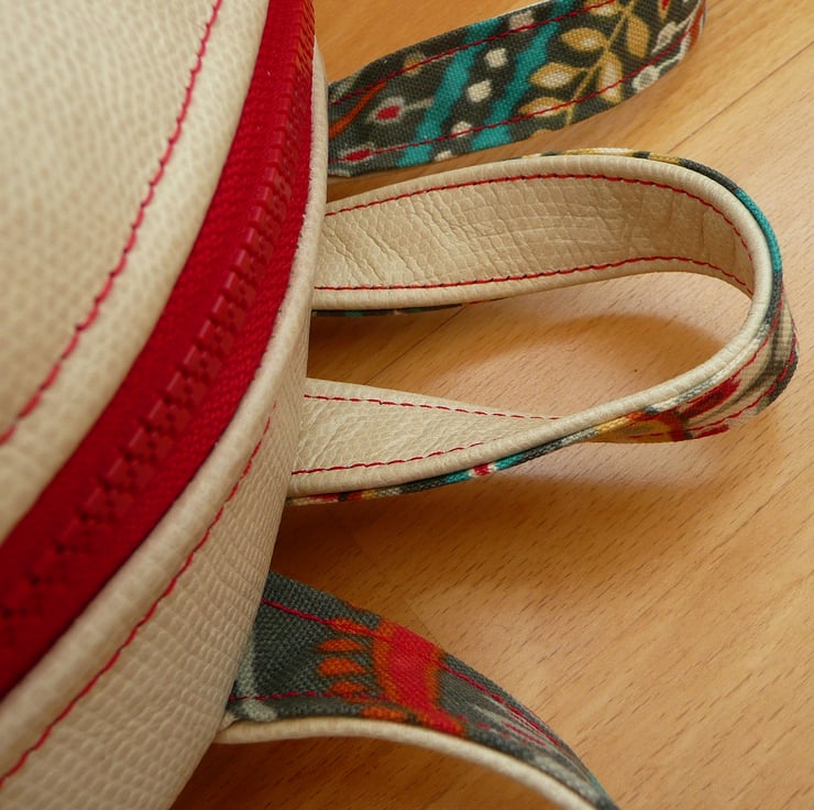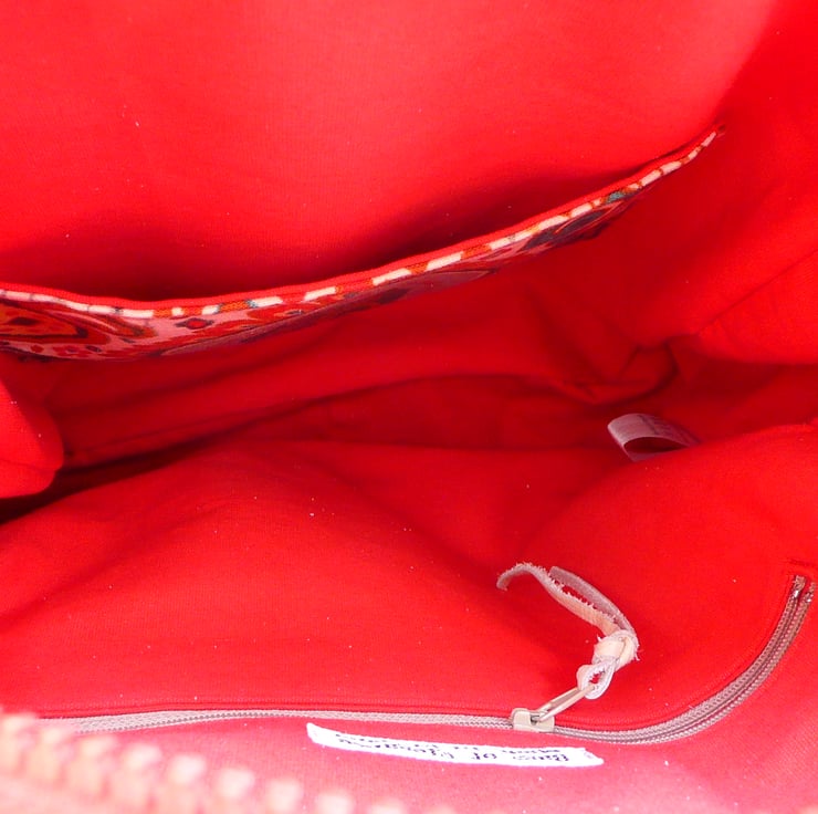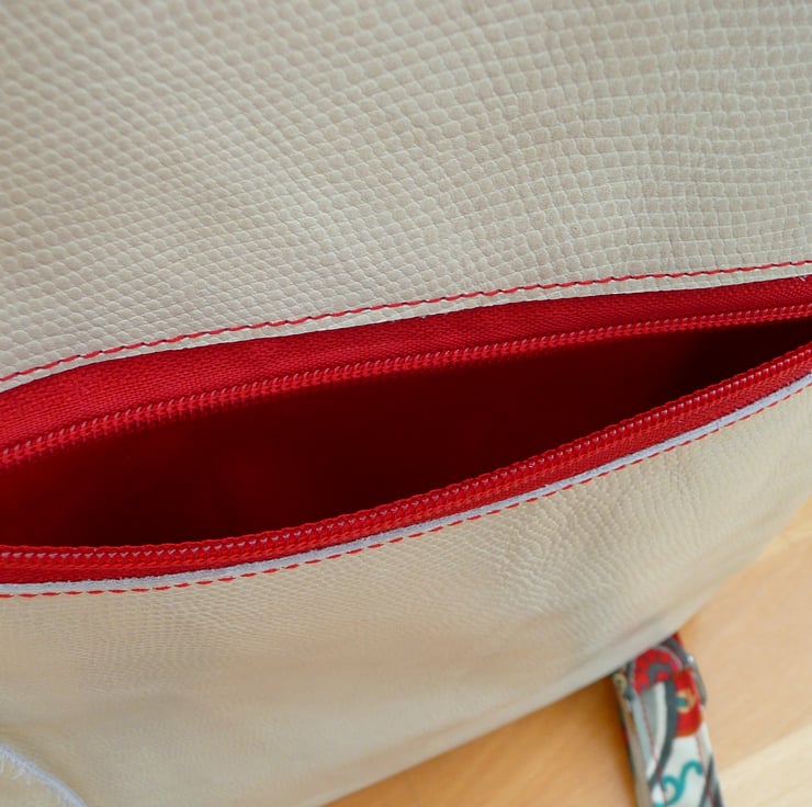 This bag features a chunky red zip top opening for the main bag, a handy hanging loop, a large slip pocket with a snap fastener on the front and a red zip pocket on the back. Inside, there is a slip pocket and a zip pocket. The adjustable shoulder straps are 1" wide and are made from a combination of both cream leather and fabric. All bag hardware is in silver nickel.