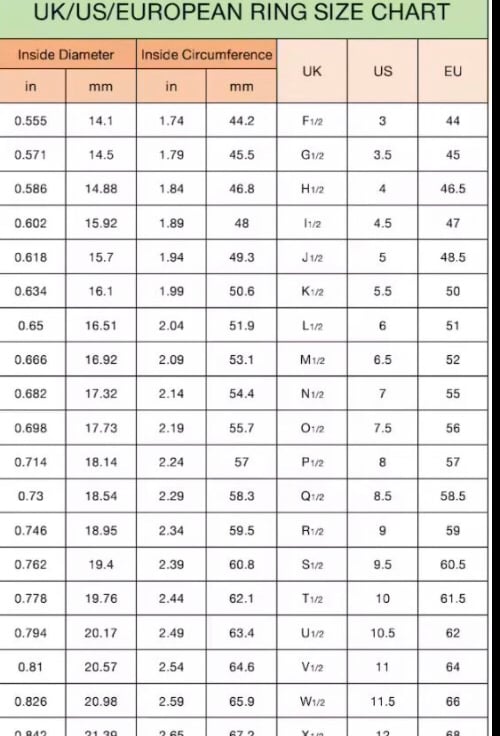 To find your ring size, measure the circumference of your finger, and use the chart in photos to find your size. Alternatively, measure the inside circumference of your favourite ring.