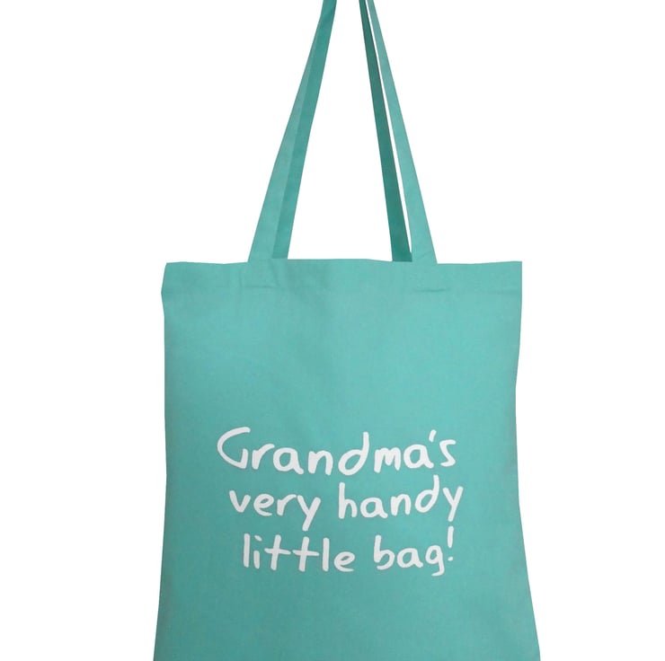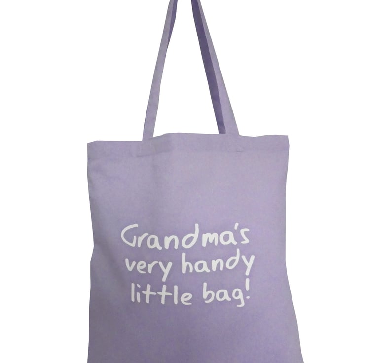 Hand screenprinted cheeky Grandma logo on a 100% cotton tote bag. Delicate lilac or mint green colour. Size 16" x 16" plus long handles.