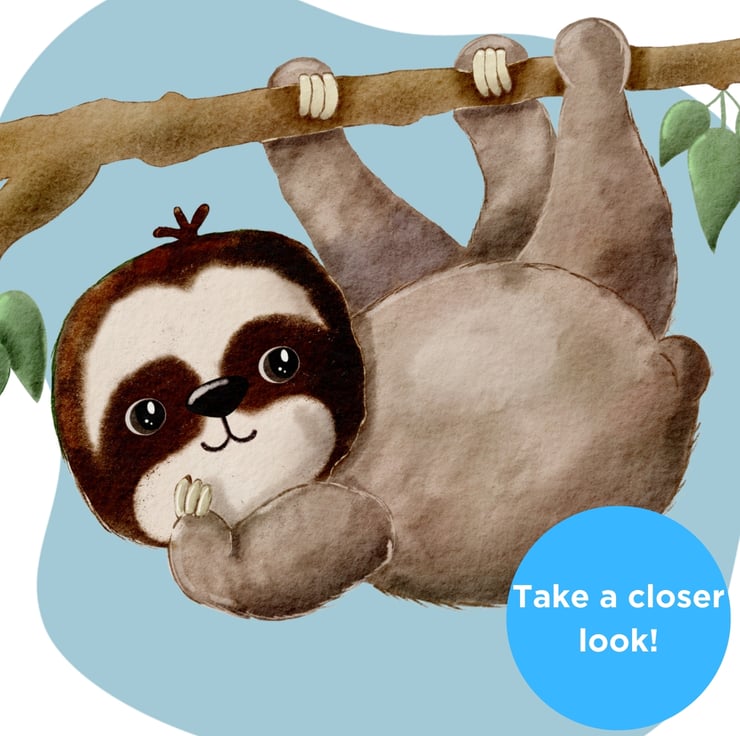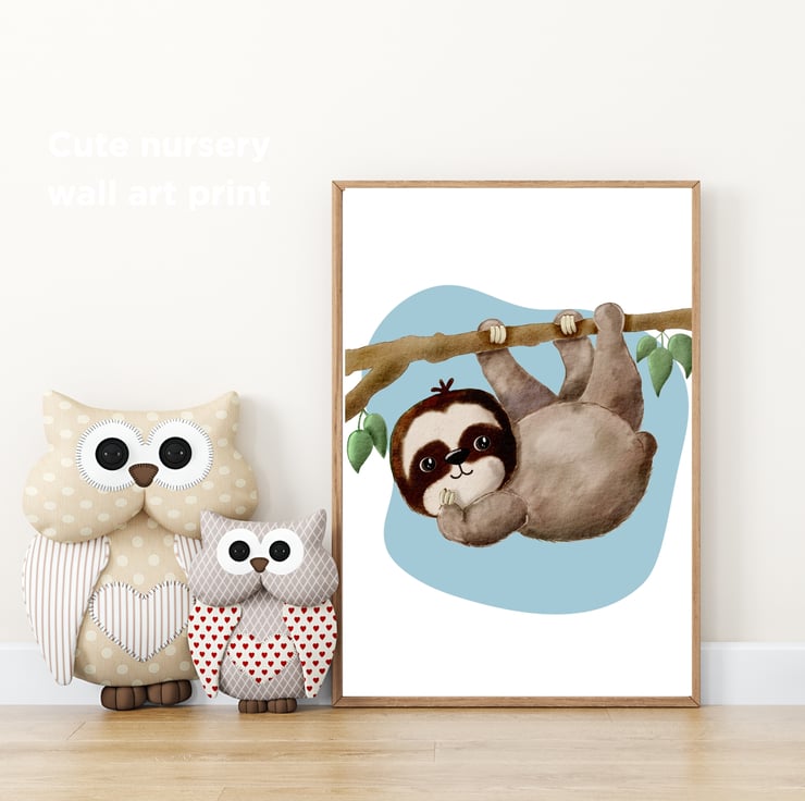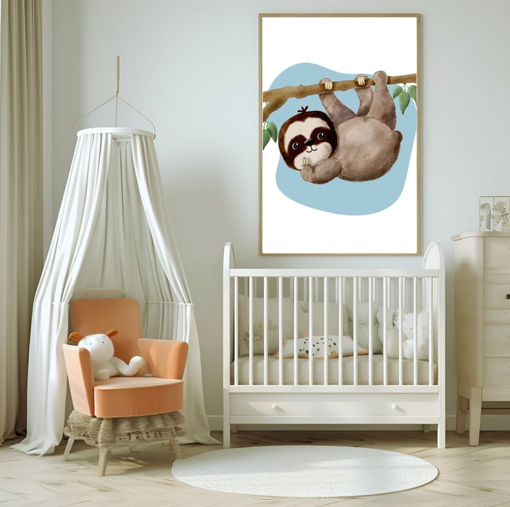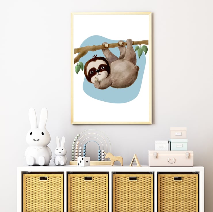 Looking for some cute and original hand-drawn artwork for your little one's nursery, bedroom or playroom? This adorable print of a baby sloth hanging from a branch will spark your child's imagination transporting them on a magical adventure to the Amazon rainforest. The print will also ignite their curiousity, fostering a love for the natural world.