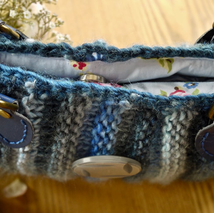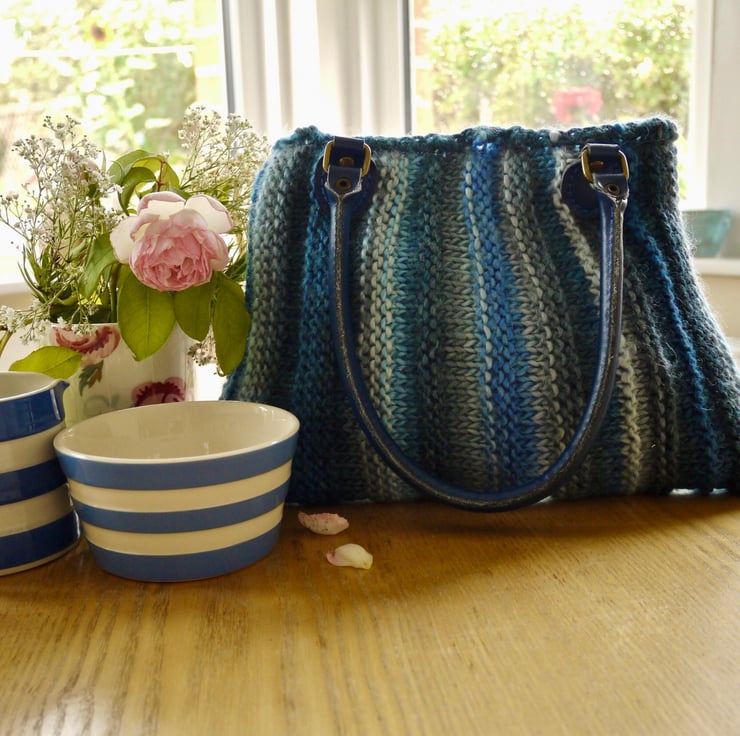 A cute little stripey blue knitted woolly handbag with leather handles.