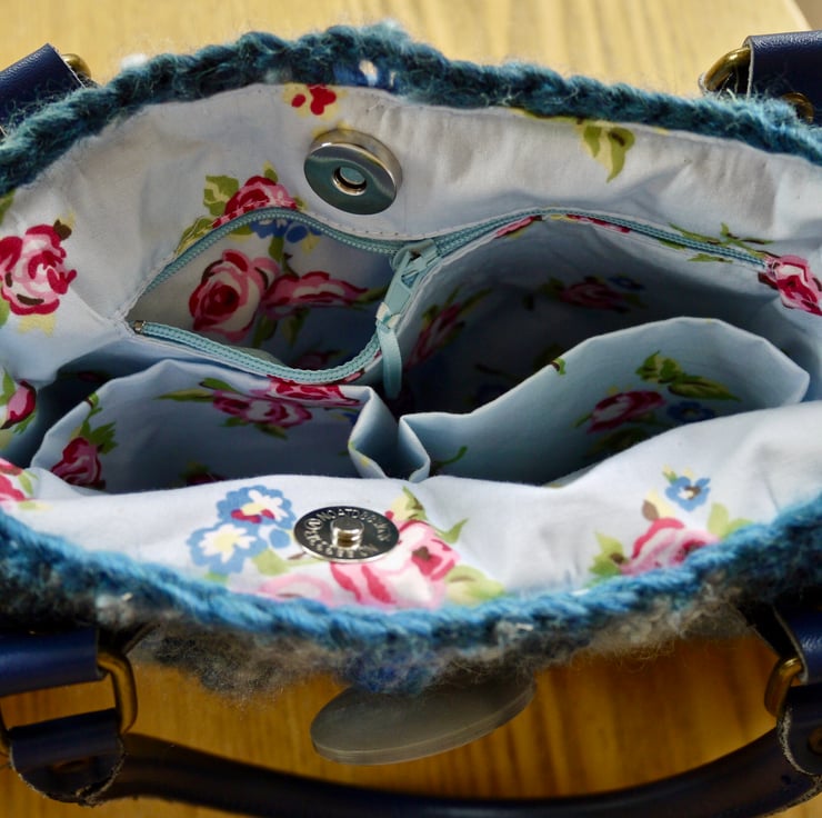There is a central magnetic fastener and a pretty blue floral cotton print lining, which ensures the bag keeps its shape once you’ve filled it! Two open pockets allow you to find your phone and keys in a hurry and a zipped pocket with a beaded zip pull keeps things safe.