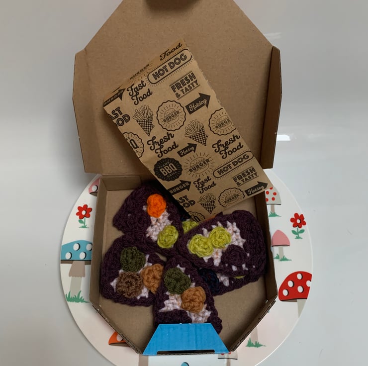 Hand crocheted play food - pizza in its own box - cute little slices - serve up as a whole or a slice at a time …