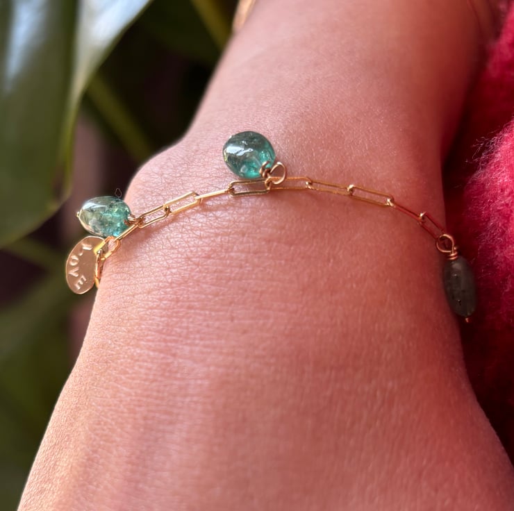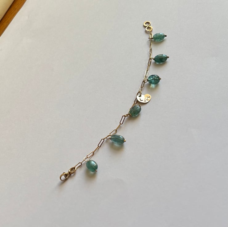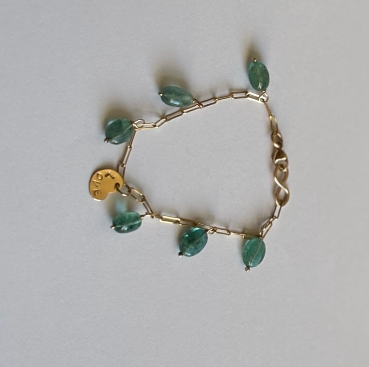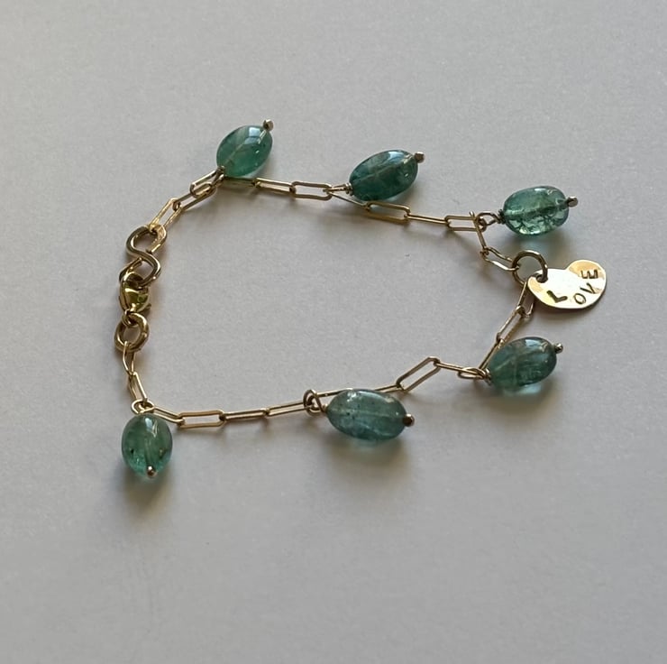 Handcrafted bracelet features six natural emerald beads.each with a stunning oval beads . The emerald are evenly long spaced along a delicate 14ct Rolled gold filled paper clip-style chain, The bracelet is anchored by a secure lobster with small disc charm engraved with “ LOVE “ stamp on it .