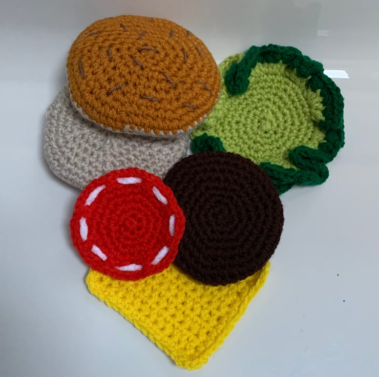 Hand crocheted play food - hamburger in its own box - cute little hamburger serve up as a whole or an item at a time …