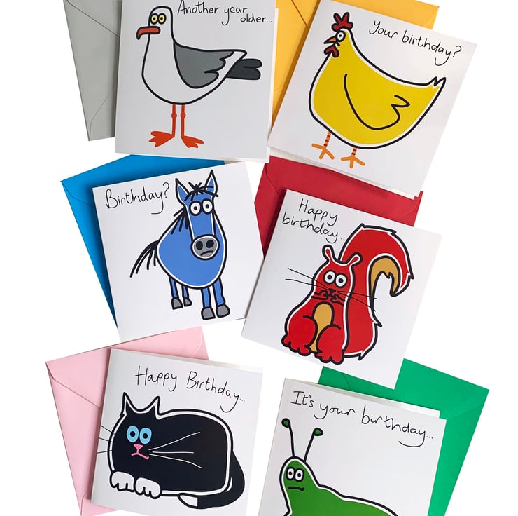 Pack of 6 screenprinted original Birthday cards. All have matching colour co-ordinated envelopes. Cute designs that are suitable for adults & children as no rude words. Funny slogans that carry on inside. Printed onto top quality heavyweight card.