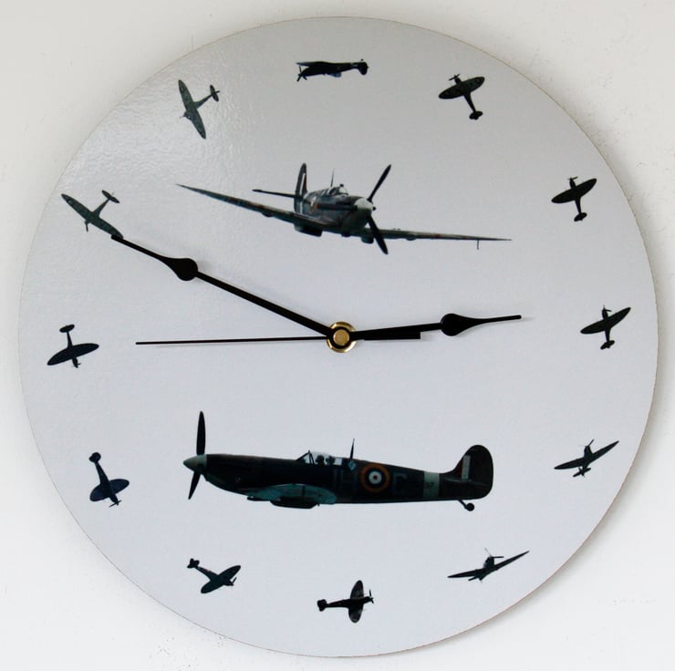 The photos are by Picture That Image and are sublimated on to a 28cm diameter Aluminium clock face which is fitted to a wooden backing for additional strength. The clock dial is a series of photos of the Spitfire doing a Loop-the-Loop. The clock is supplied in a white gift box. It uses a single AA battery which IS supplied with the clock