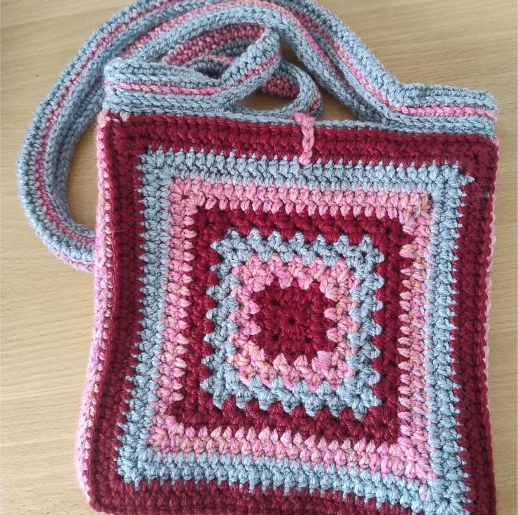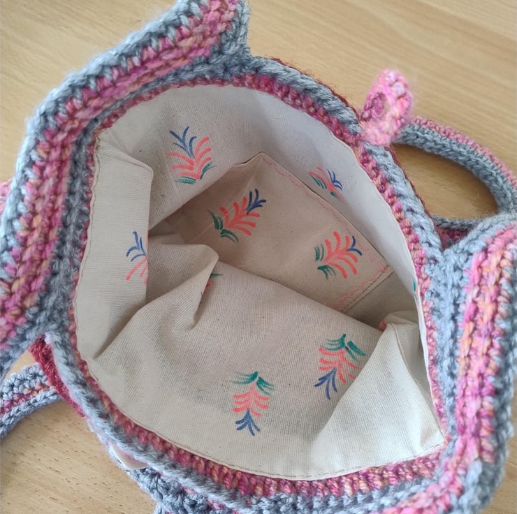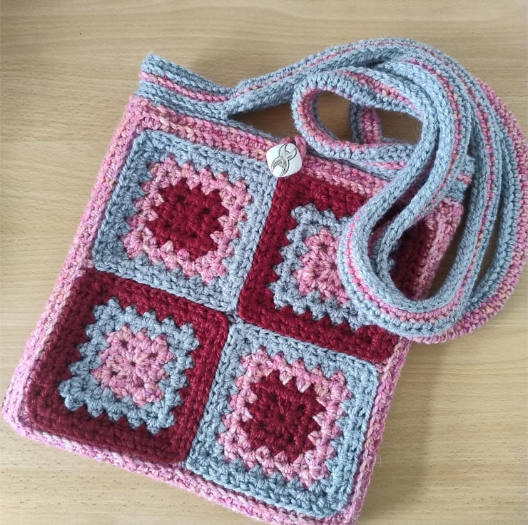 This pretty shoulder tote bag is designed in the Granny Square style, and features two shoulder straps, a button fastening, and a hand decorated cotton calico lining with an internal pocket.