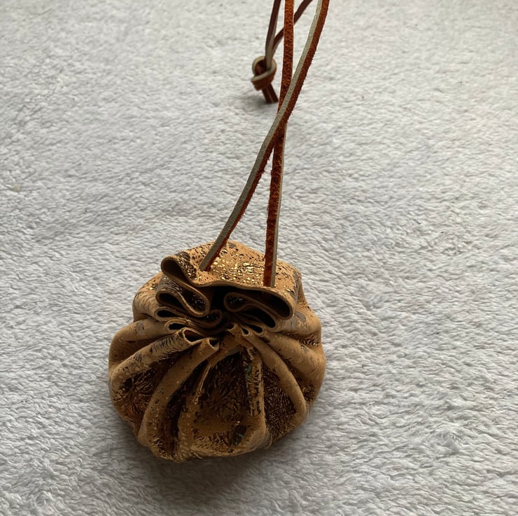 The pouch is made from a soft (but firm) metallic gold coloured leather and the draw string is a rust brown latigo coloured lacing.