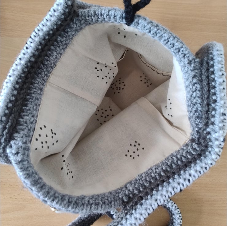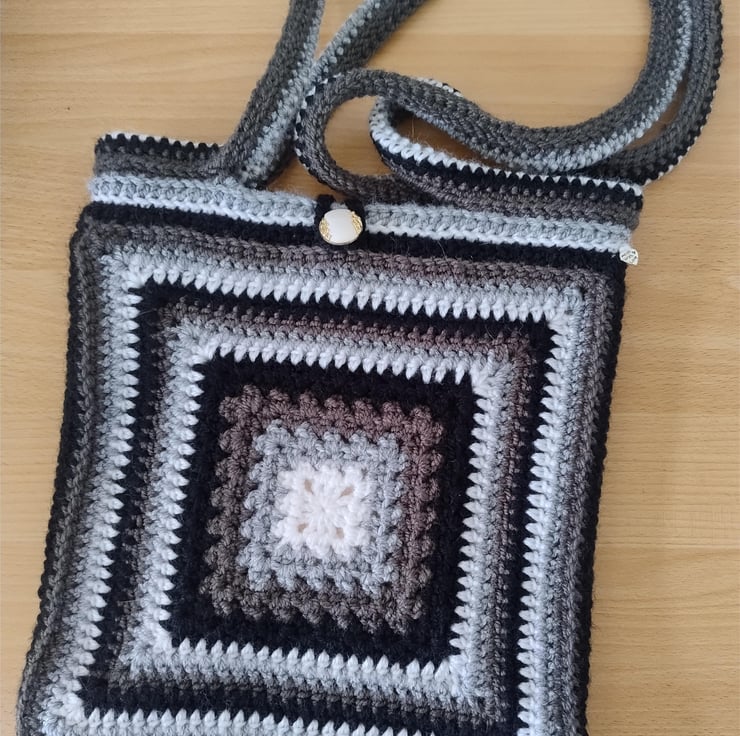 The front and back are worked as a large Granny Square in black, grey and white aran weight yarn, making the bag nice and soft but hardwearing.