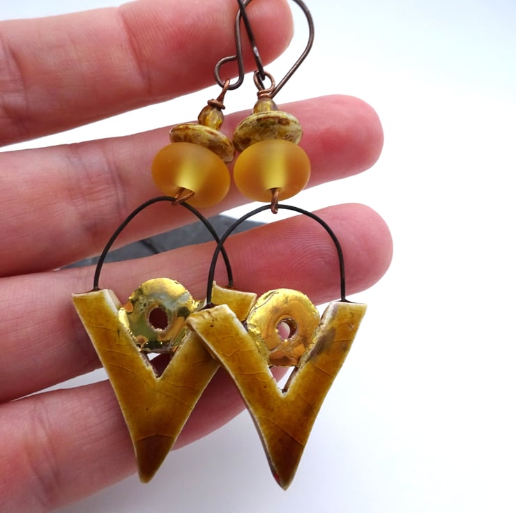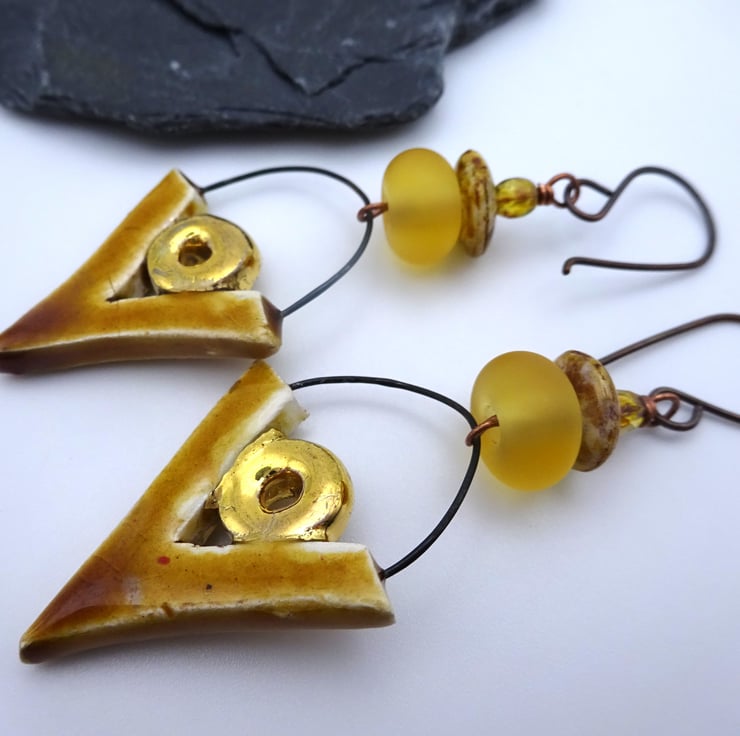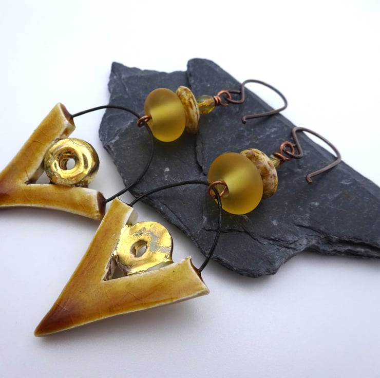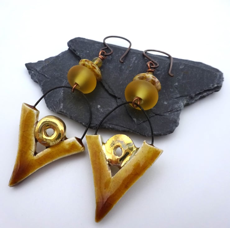 A pair of earrings made with handmade copper ear wires, Czech glass disc beads, handmade lampwork glass amber frosted beads and handmade ceramic charms.