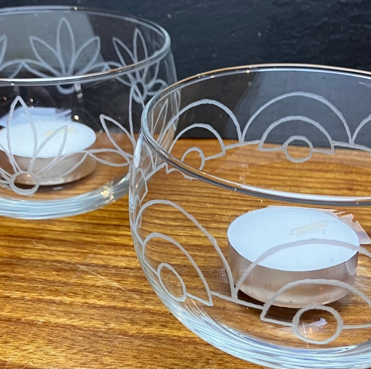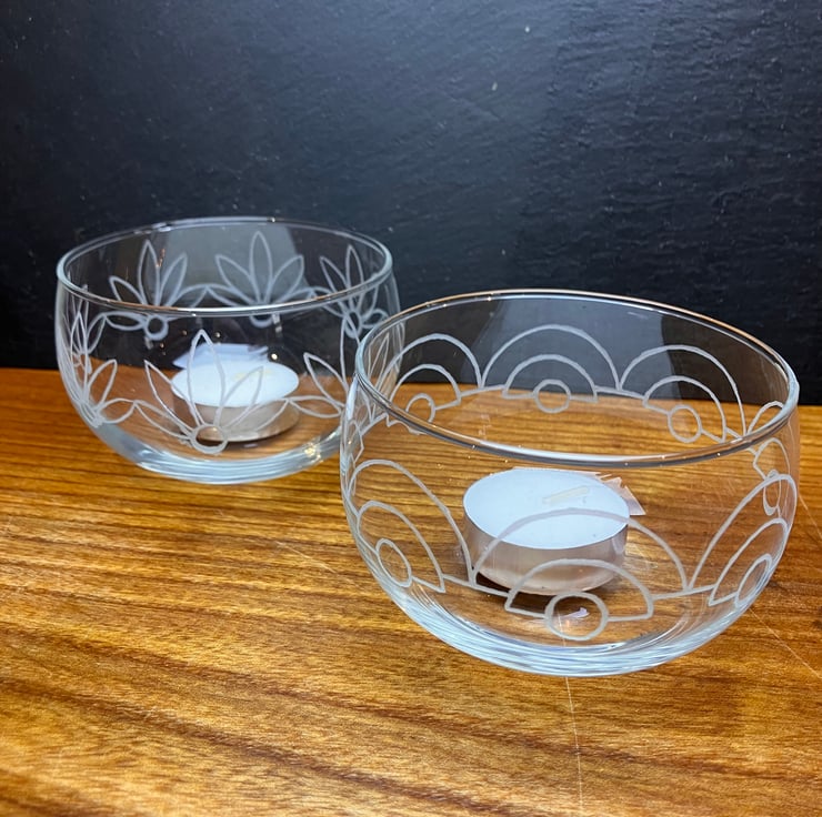 This pair of glass tea-light holders have been hand engraved with Art Deco inspired designs to bring some sparkle and glitz to those darkest of corners. Perfect for cosy evenings and entertaining!