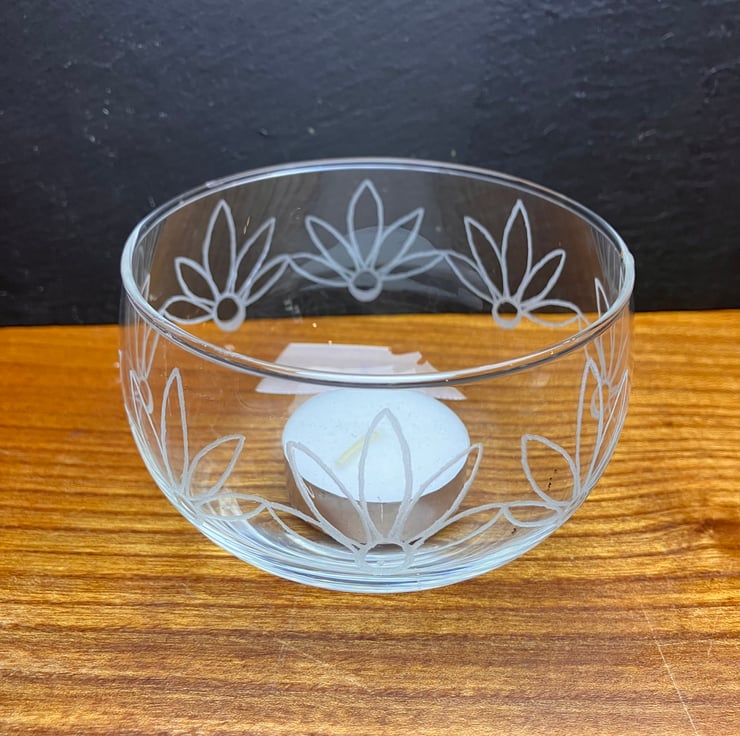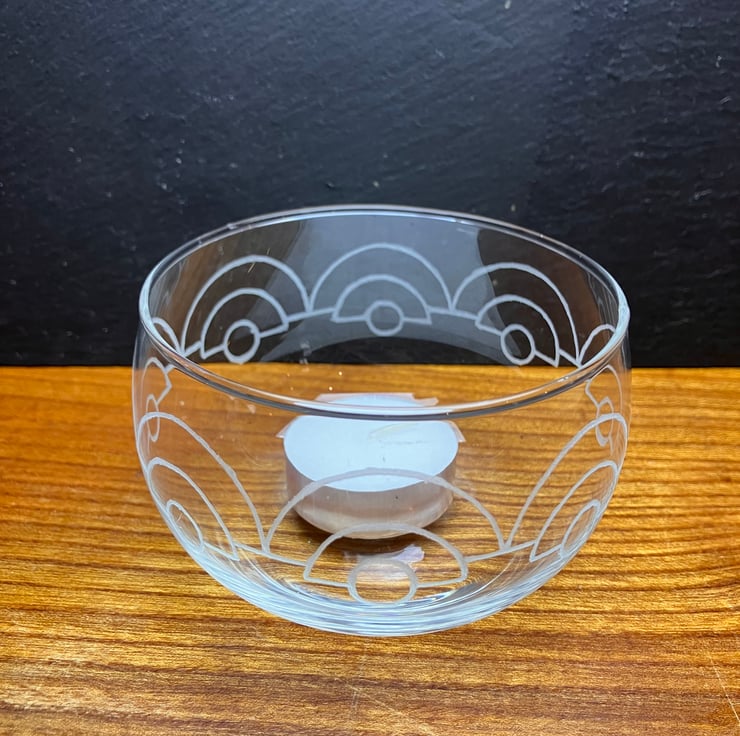 Glass is a wonderful natural material to work with and that can be transformed so simply. My art deco inspired designs are technically more difficult to produce, relying on prior measurements for each individual item, the basic outline is first drawn on in ink to ensure symmetry is kept, which is then hand engraved.