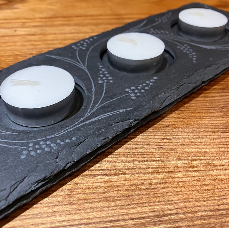 This slate tea-light holder has been hand engraved with grape hyacinths. I love these dainty flowers popping up in my garden with a burst of colour at the start of spring, ahead of the bluebells. And what a pretty transformation for this plain secondhand tea-light holder, now an ideal centrepiece for spring and summer evenings!
