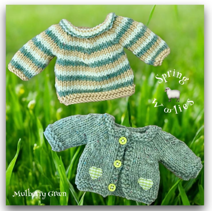 A pretty little pale green cardigan, decorated with two little gingham hearts, to fit the Mulberry Green dolls. The cardigan is hand knitted and is finished off with three little buttons.