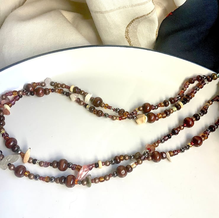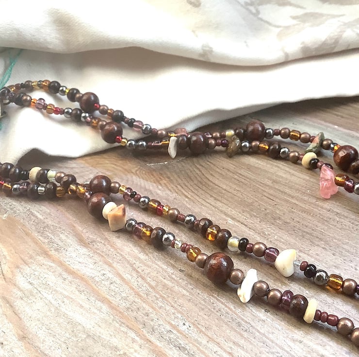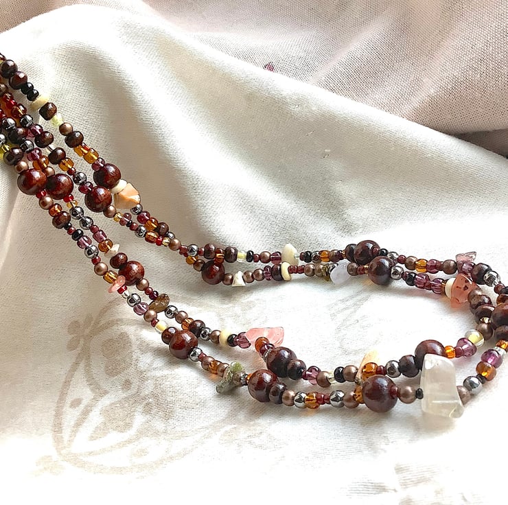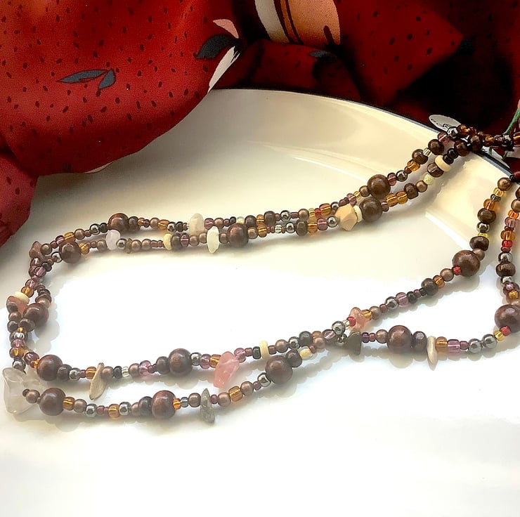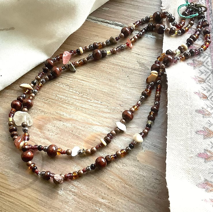 2 strand necklace; rustic cottage core style. Made with gemstone chips, wooden and acrylic beads