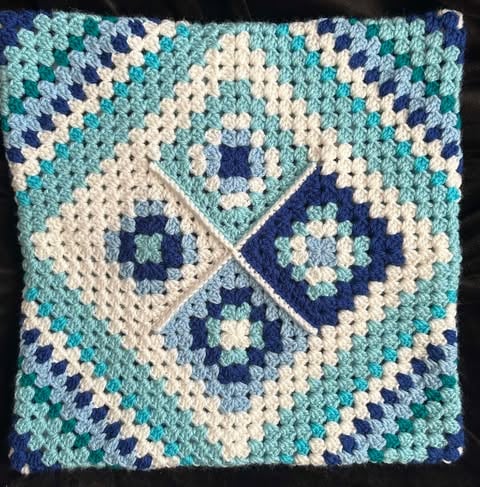One side with 4 granny squares, carefully crafted in mixed colors to induce the effect of symmetry.