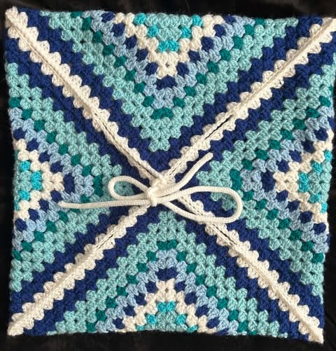 Home Decor cushion cover, a handmade crocheted, granny square pattern , two sides, in different shades of blue and white.