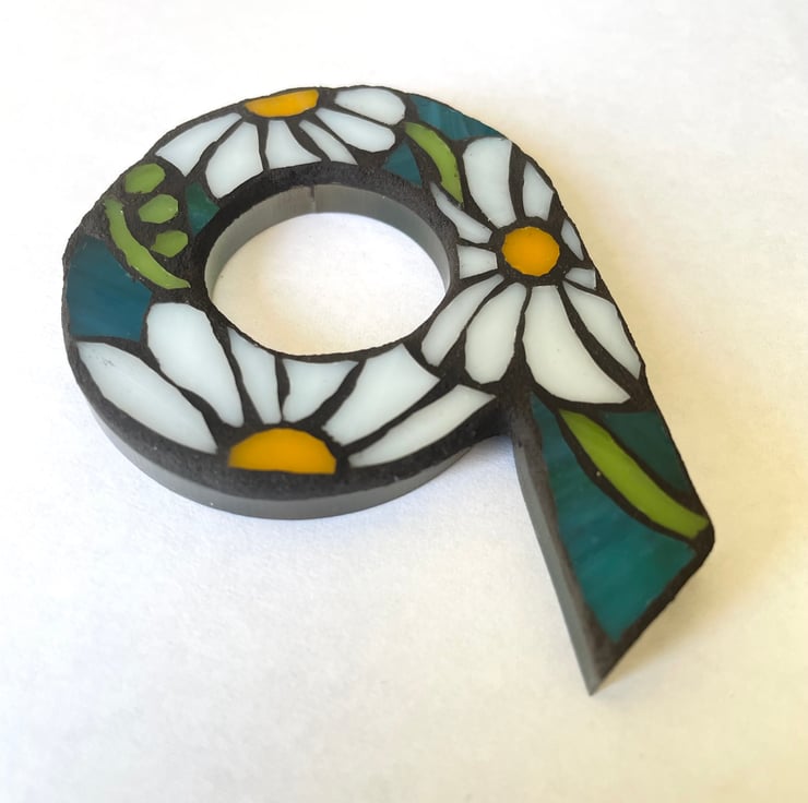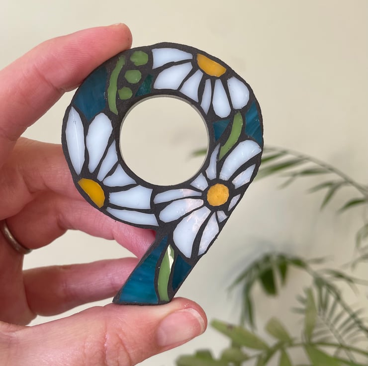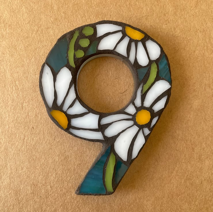 This mosaic door / postbox number is crafted with hand cut stained glass on acrylic substrate. Measure 7.5cm in height. No drilling or screws required, simply peel and stick.