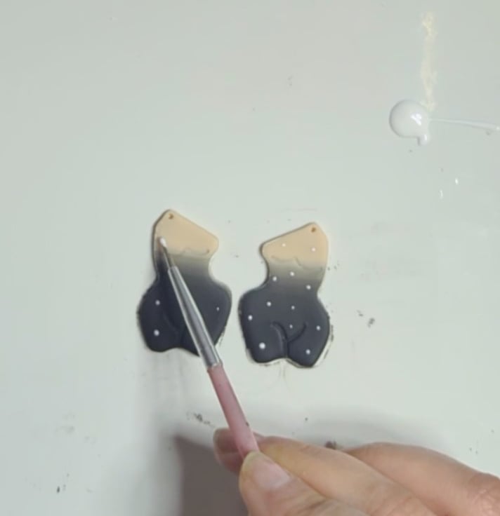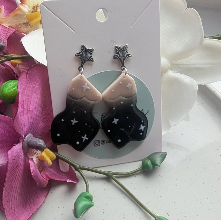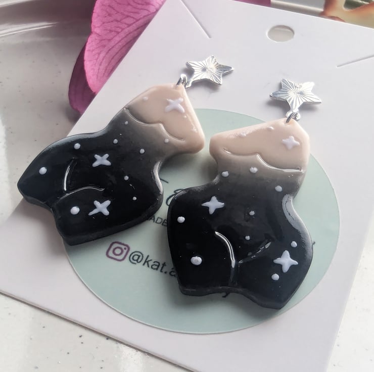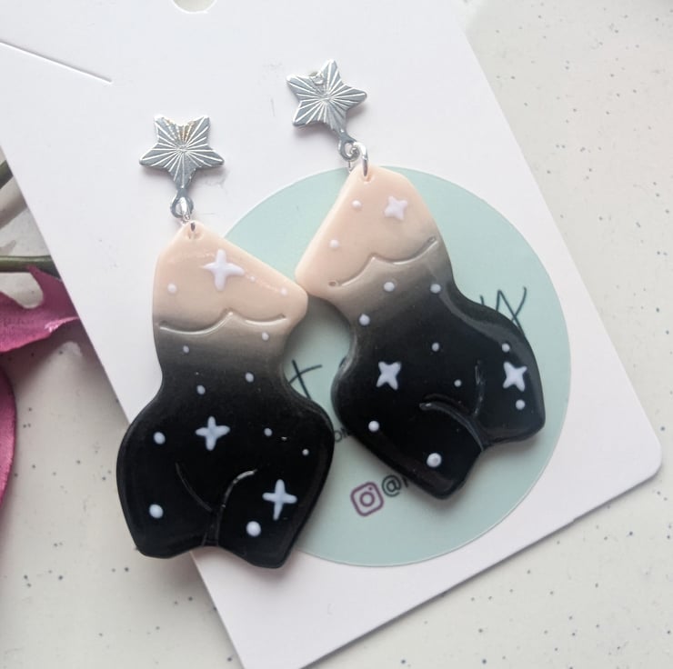 Black and cream blended earrings hand finished with white stars, in the shape of a female body. Finished with a shiny glaze.