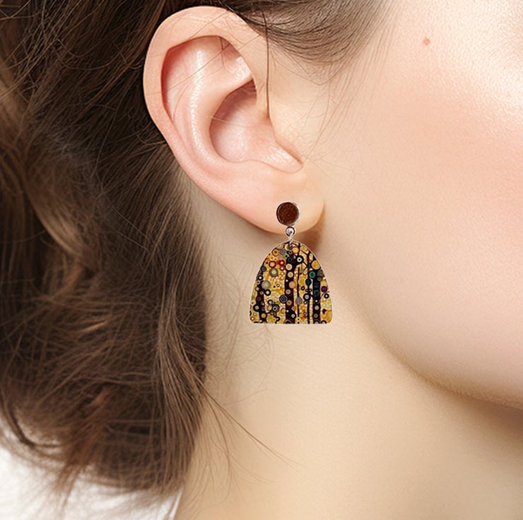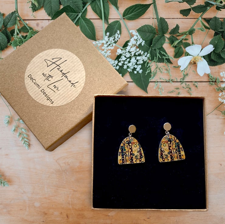 I have handmade these stud earrings with permanent artwork. The drops have a black trees design on a yellow ochre background, An ideal gift for someone who loves artistic jewellery. A matching pendant and bracelet are available.
