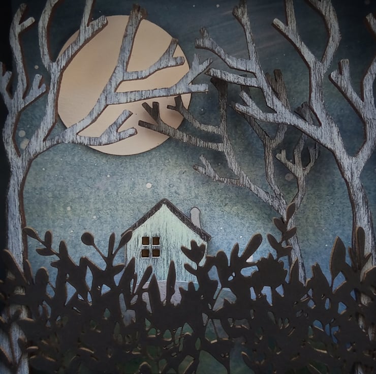 'The Way to the Woods' - a full moon shines over a little house tucked away in the forest, surrounded by trees and foliage.