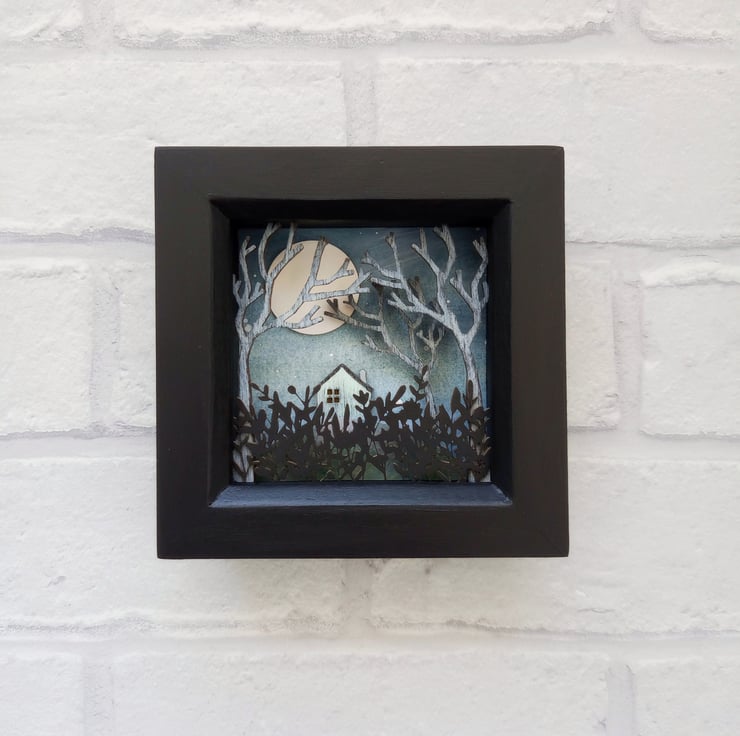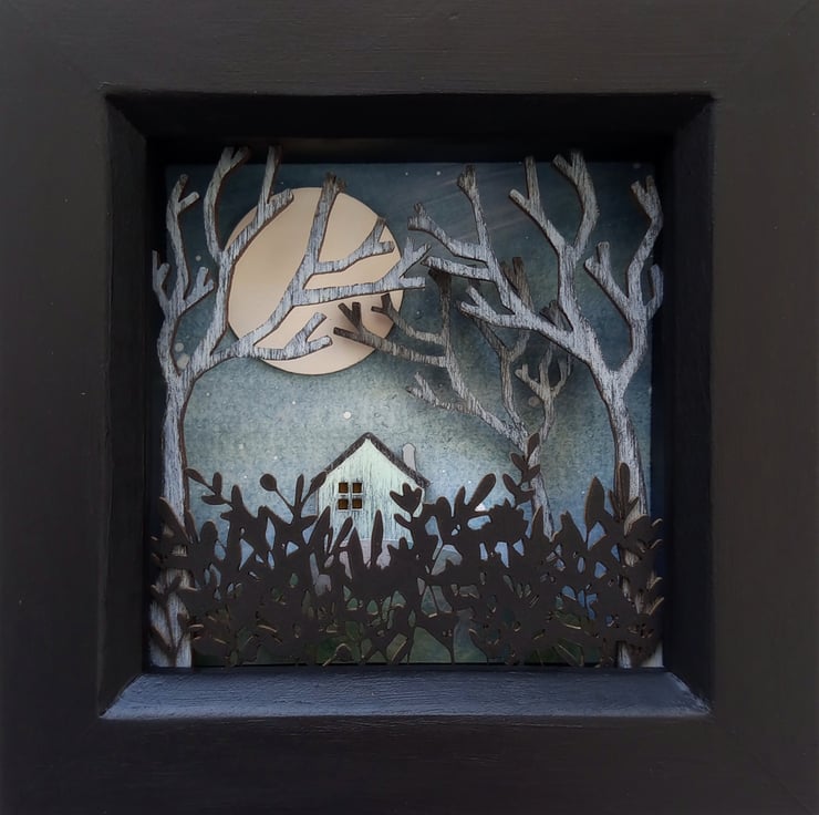 The design comes from original drawings which have been transformed into layers of laser cut wood, which I paint by hand, build up to form 3d layers and set into a glazedblack wooden box frame, which measures approx. 11.5cm; the scene itself measures 7.5cm x 7.5cm x 1.5cm.