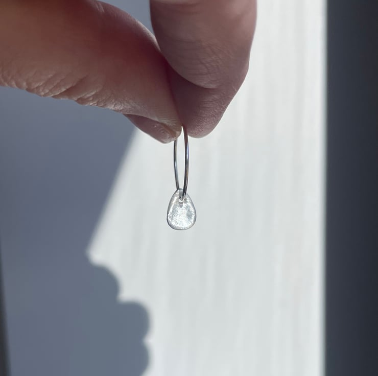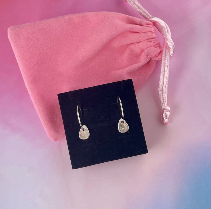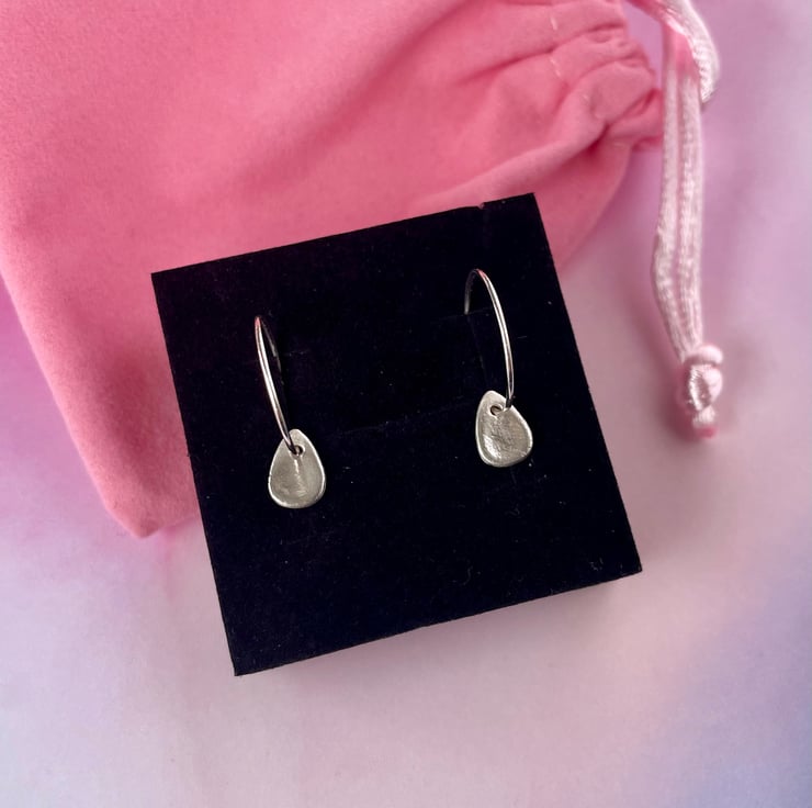 Delicate little teardrop charms made with 999 silver (99.9% pure silver) on 925 Sterling Silver wire hoops. Lightweight and comfortable to wear.