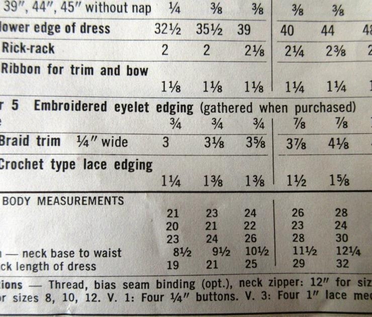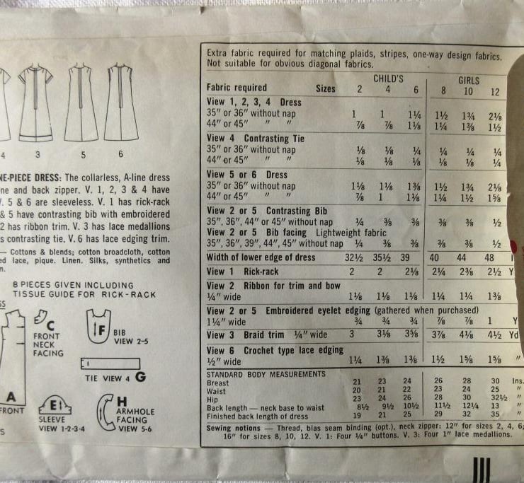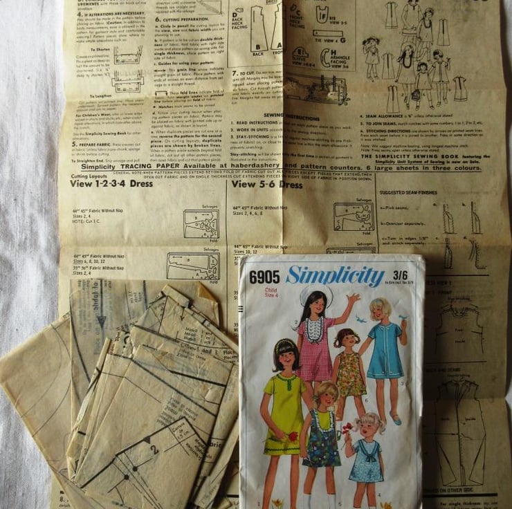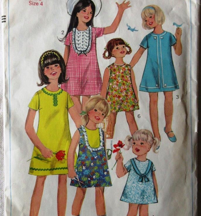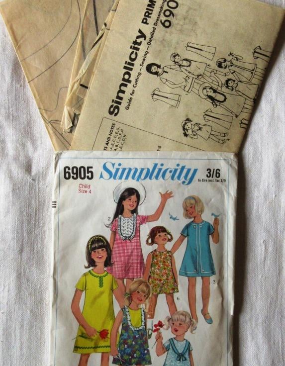 A vintage sewing pattern for a little girl's dress in size 4 (chest 23"/58 cm, Simplicity 6905). The collarless A-line dress has high round neckline and back zipper. Views 1, 2, 3 and 4 have short set-in sleeves. Views 5 and 6 are sleeveless. View 1 has rick-rack and button trim. Views 2 and 5 have contrastng bib with embroidered eyelet edging trim. View 2 has ribbon trim. View 3 has lace medallions and braid trim. View 4 has contrasting tie. View 6 has lace edging trim. The pattern includes a guide for placing the rick-rack. Only the main front and back pieces of the pattern have been used. The pattern is dated 1966. There is some pencil handwriting from the previous owner on the envelope.