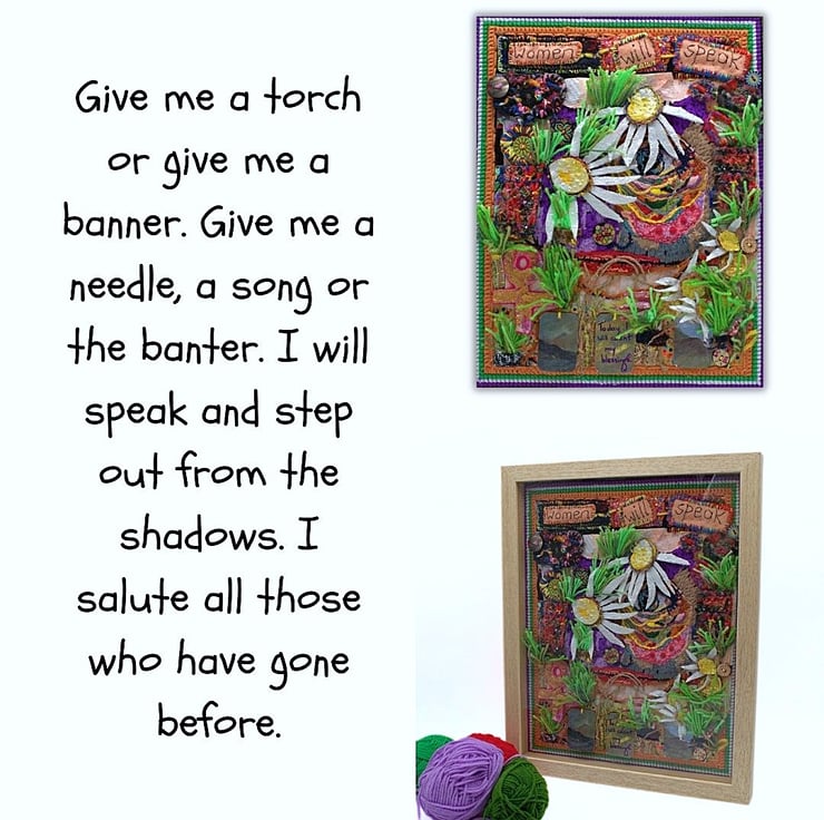 This is an original framed textile piece. It explores the increasing pressure on women to conform to challenging social expectations linked with ideologies. I have used various needlework techniques to link the present day with women who had or chose to pick up the needle. I have also used old buttons, painted wooden tags, old maps and texts to help signify the passing of time and sense of place.