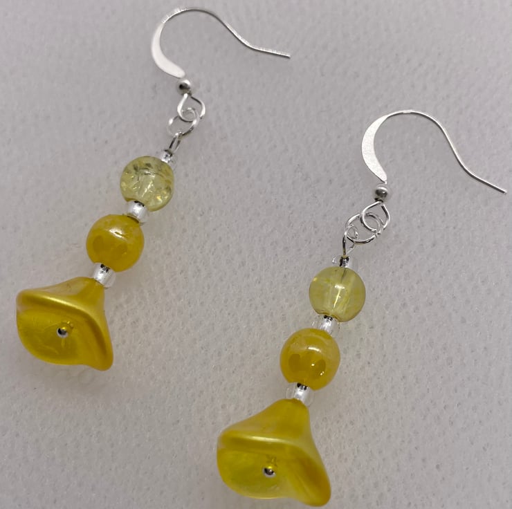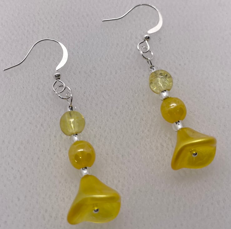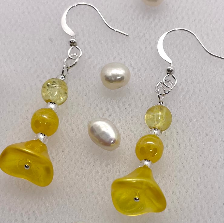 Cheer yourself up with buttercup dangle Earrings for Easter! . Two citrine gemstones and a yellow flower bead dangle from silver plated earring hooks.