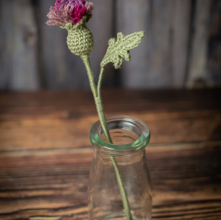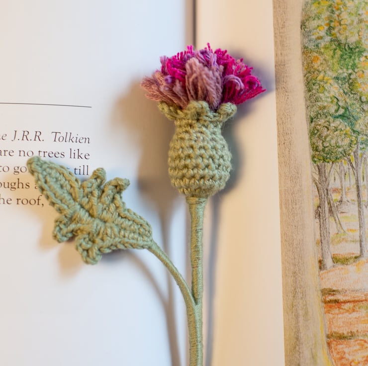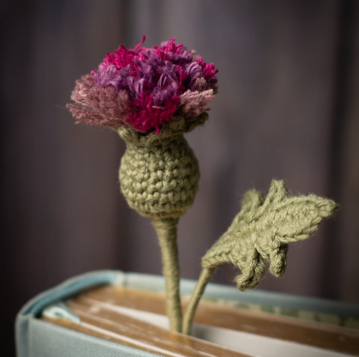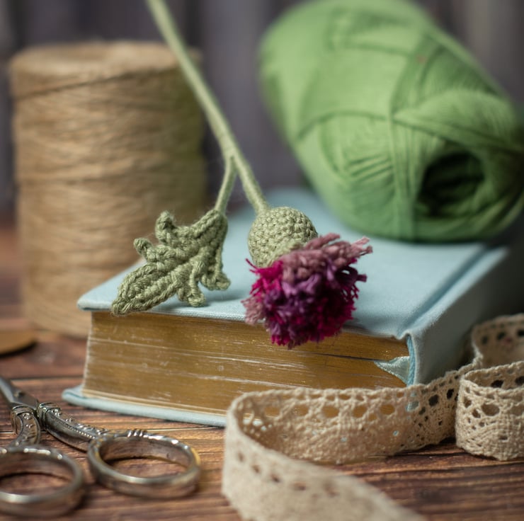 Thistle Flower Crochet Bookmark - a perfect gift for a book lover or a plant lover, someone of romantic nature, stationery fan or flower enthusiast. Can also be used as a decor item, it looks as good in a vase as it looks in a book. Thistles symbolise devotion, bravery, determination, and strength.