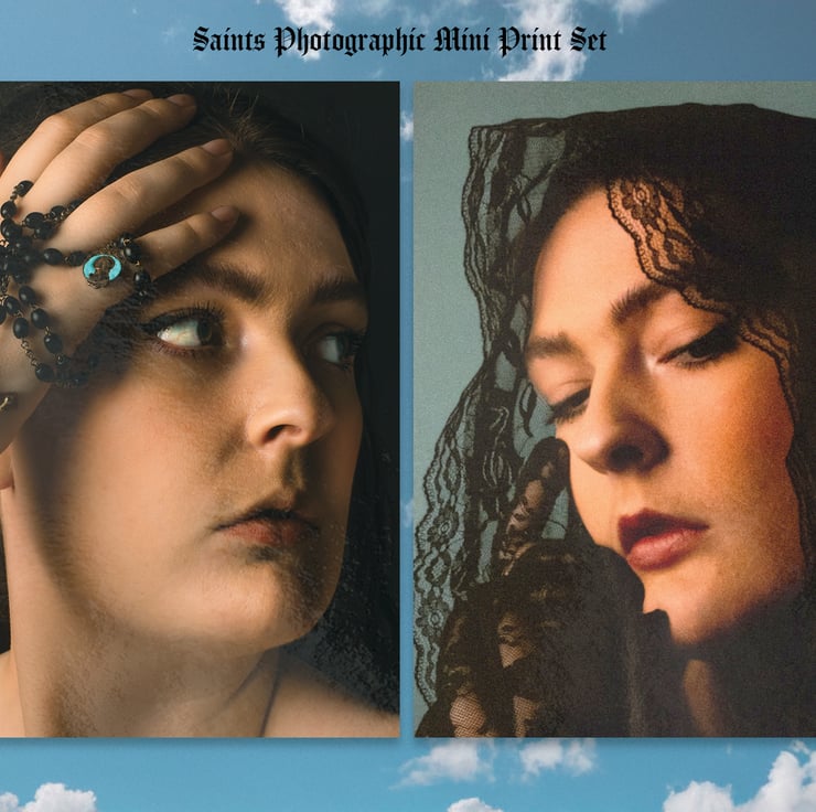A set of two A6 mini prints from my award-winning Every Saint Has a Past photographic series. This set features one print of Saint Gemma and one of Saint Bernadette. The photographs are printed on good quality card with a gloss coat only on the side with the image, leaving the back free to be written on if desired.