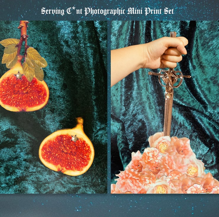 A set of two A6 mini prints from my series "Serving Cnt" which visualises different euphemisms for the female anatomy. In this pack, you get one print of "Forbidden Fruit" and one of "Sheath". The photographs are printed on good quality card with a gloss coat only on the image side, leaving the back free to be written on if desired.