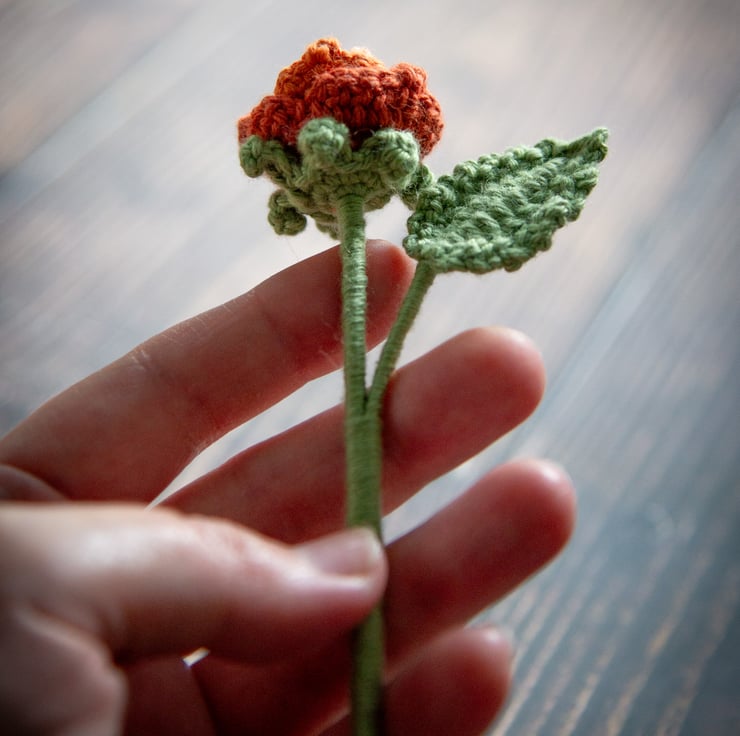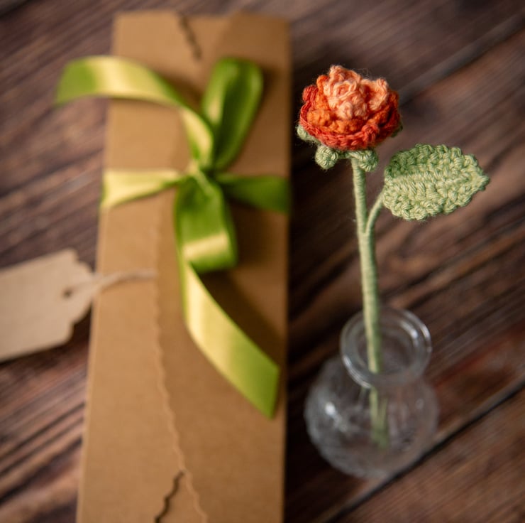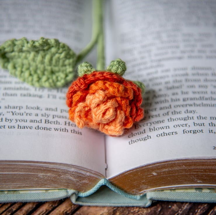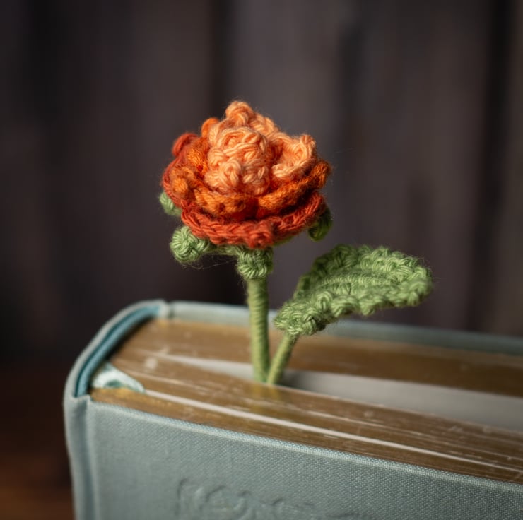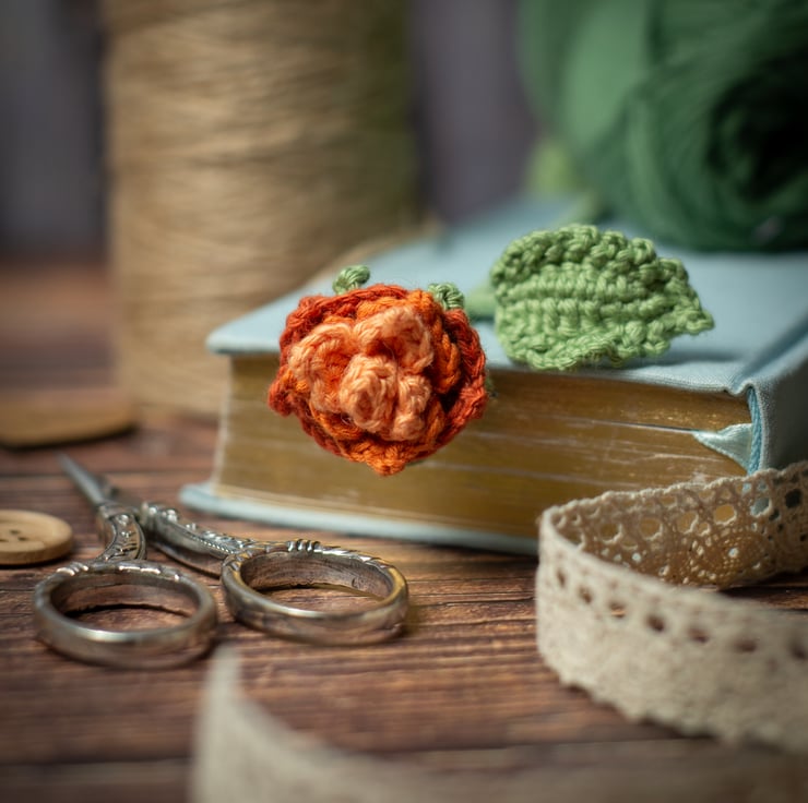 Rose Crochet Bookmark - a perfect gift for a book lover or a plant lover, someone of romantic nature, stationery fan or flower enthusiast. Can also be used as a decor item, it looks as good in a vase as it looks in a book. Orange Roses symbolise enthusiasm, desire, and fascination. Roses are also June Birth Flowers.