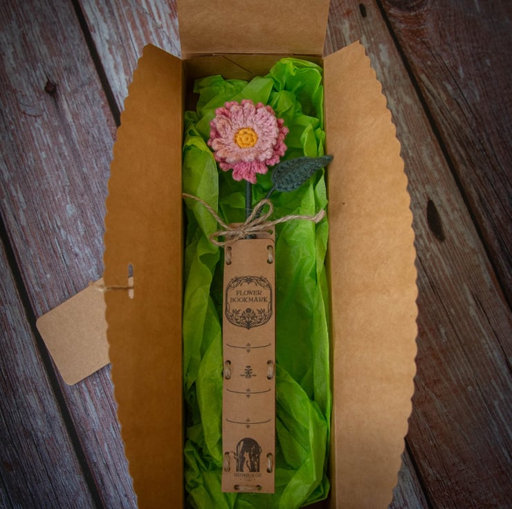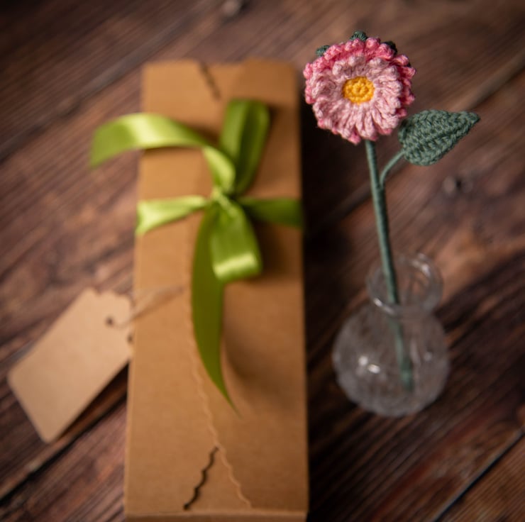 Aster Flower Crochet Bookmark - a perfect gift for a book lover or a plant lover, someone of romantic nature, stationery fan or flower enthusiast. Can also be used as a decor item, it looks as good in a vase as it looks in a book. Asters symbolise love, wisdom, faith, and hope, and pink asters in particular are associated with kindness and love. Aster is also a September Birth Flower.