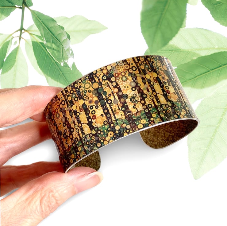 This is a cuff bracelet which I have handmade. It is a wide metal bangle with a Klimt inspired tree design in yellow ochre colour. Matching earrings and pendant are available. In addition, for a small fee, a personalised message can be engraved on the reverse (Optional).