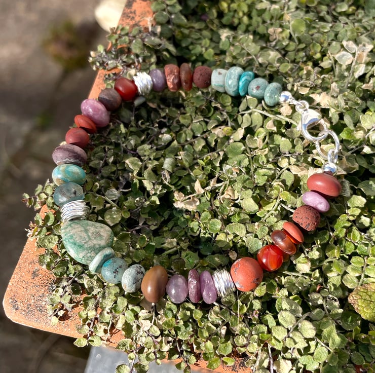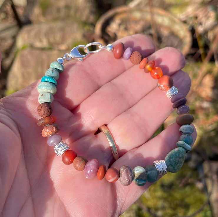 I have mixed beads in orange and terracotta with turquoise blues and some plums, there are 3 fine silver wire wrapped nest beads. The bracelet closes with a large silver trigger clasp.